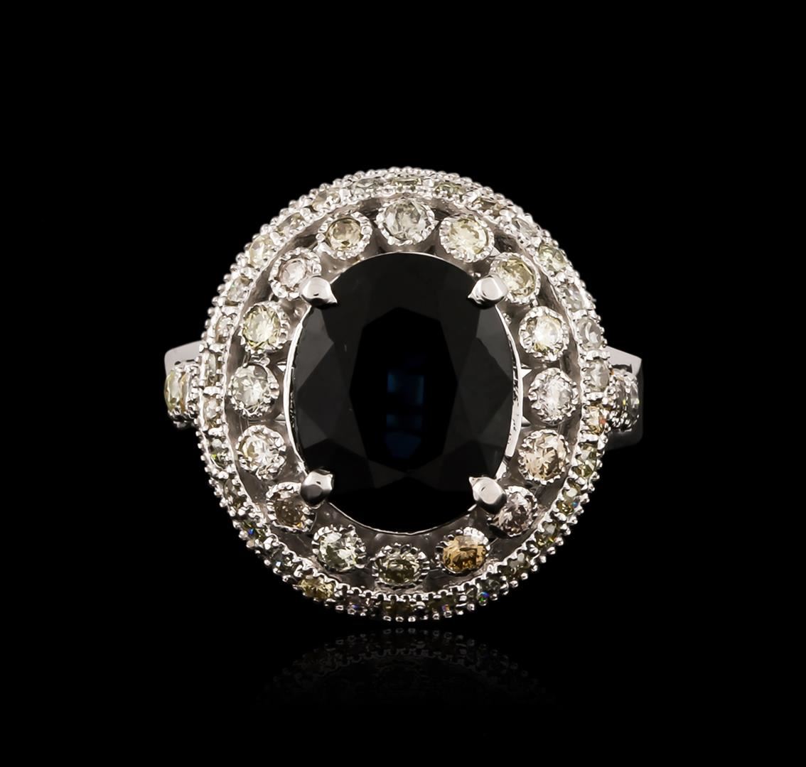 One electronically tested 14KT white gold ladies cast sapphire and diamond ring. The featured sapphire is set within tiered diamond bezels supported by a lattice under gallery and diamond set shoulders, completed by a two millimeter wide band. Bright polish finish with milgrain detailing. Identified with markings of "14K". Condition is new, good workmanship. Containing: One prong set oval mixed cut natural blue sapphire, measuring 10.90 x 8.45 x 4.50mm, 6% bulge factor, approximate weight of 3.57ct., clarity is slightly included, type II, dark, very slightly grayish, very slightly greenish blue color, (GIA vslgB 7/3), cut is good. Transmitting light with a minimum of distortion, transparent. Naturally occurring internal & external characteristics are present. Intermittent color zoning. Graded in the setting. Fifty-Two bezel set round brilliant cut diamonds, measuring 2.00 - 1.70 x 1.11mm (depth est.) approximate total weight of 52 Stones = 1.20ct. Faint brown secondary color throughout. Graded in the setting. Clarity: SI-1 to I-1. Color: K - M. Total Weight of Colored Stones 3.57ct. Total Weight of Diamonds 1.20ct. Total Weight of Ring 6.02 grams. AIG Appraised at $4,300.00.