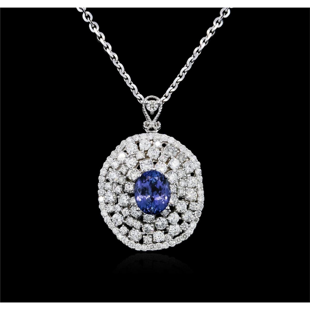 One electronically tested 14KT white gold ladies combination cast & assembled tanzanite and diamond pendant & chain 18.0" long, cable link with a lobster claw clasp with a bright polish finish. Identified with markings of "K14". Condition is new. Containing: One prong set oval modified brilliant cut natural tanzanite, measuring 10.00 x 8.15 x 6.23mm, approximate weight of 3.57ct., clarity is eye clean, type I, medium light, slightly grayish, violet color, (GIA V 4/2), cut is good. Forty-Nine prong set round brilliant cut diamonds, measuring 2.50 - 2.50 x 1.50mm (depth est.) approximate total weight of 49 Stones = 2.80ct. Clarity: SI-1. Color: J - K, Cut is Good. Fifty-Five prong set round brilliant cut diamonds, measuring 1.50 - 1.50 x 0.90mm (depth est.) approximate total weight of 55 Stones = 0.68ct. Clarity: SI-1 to I-1. Color: J - K, Cut is Good. All diamonds and colored gemstones are graded in the mounting, unless otherwise stated. Colored gemstones are presumed to have been subjected to commonly used enhancement processes. Total Weight of Colored Stones 3.57ct. Total Weight of Diamonds 3.48ct. Total Weight of Pendant & Chain 15.80 grams. GGL Appraised at $12,165.00.