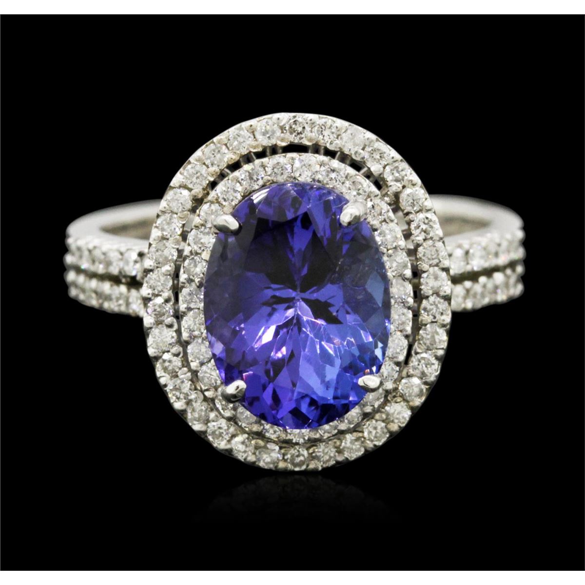 One electronically tested 14KT white gold ladies cast tanzanite and diamond ring with a bright polish finish. Identified with markings of "14K". Condition is new. Containing: One prong set oval modified brilliant cut natural tanzanite, measuring 10.50 x 7.80 x 6.20mm, approximate weight of 3.57ct., clarity is eye clean, type I, medium, moderately strong, violet color, (GIA V 5/4), cut is good. Eighty-Nine prong set round brilliant cut diamonds, measuring 1.30 - 1.30 x 0.78mm (depth est.) approximate total weight of 89 Stones = 0.71ct. Clarity: I-1. Color: H - I, Cut is Good. Colored gemstones are presumed to have been subjected to commonly used enhancement processes. All diamonds and colored gemstones are graded in the mounting, unless otherwise stated. Total Weight of Colored Stones 3.57ct. Total Weight of Diamonds 0.71ct. Total Weight of Ring 5.80 grams. GGL Appraised at $4,955.00.