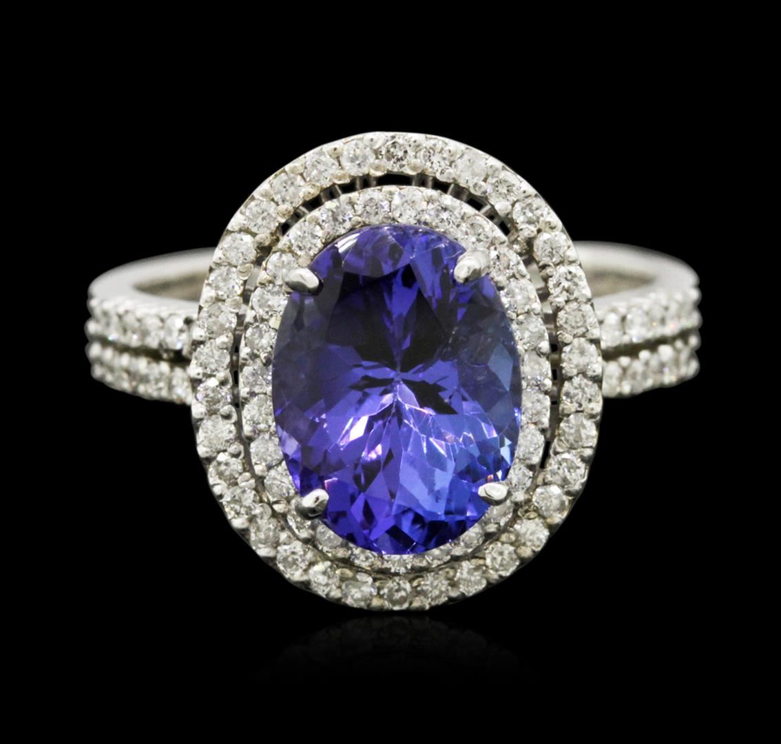 One electronically tested 14KT white gold ladies cast tanzanite and diamond ring with a bright polish finish. Identified with markings of "14K". Condition is new. Containing: One prong set oval modified brilliant cut natural tanzanite, measuring 10.50 x 7.80 x 6.20mm, approximate weight of 3.57ct., clarity is eye clean, type I, medium, moderately strong, violet color, (GIA V 5/4), cut is good. Eighty-Nine prong set round brilliant cut diamonds, measuring 1.30 - 1.30 x 0.78mm (depth est.) approximate total weight of 89 Stones = 0.71ct. Clarity: I-1. Color: H - I, Cut is Good. Colored gemstones are presumed to have been subjected to commonly used enhancement processes. All diamonds and colored gemstones are graded in the mounting, unless otherwise stated. Total Weight of Colored Stones 3.57ct. Total Weight of Diamonds 0.71ct. Total Weight of Ring 5.80 grams. GGL Appraised at $4,955.00.