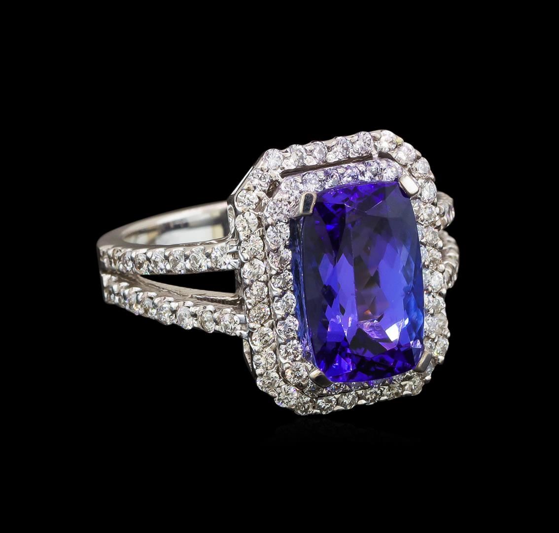 One electronically tested 14KT white gold ladies cast tanzanite and diamond ring with a bright polish finish. Identified with markings of "K14". Condition is new. Containing: One prong set rectangular cushion modified brilliant cut natural tanzanite, measuring 12.10 x 7.60 x 4.94mm, approximate weight of 3.58ct., clarity is eye clean, type I, medium light, very slightly grayish, violet color, (GIA V 4/3), cut is good. Ninety-Four prong set round brilliant cut diamonds, measuring 1.50 - 1.30 x 0.84mm (depth est.) approximate total weight of 94 Stones = 0.94ct. Clarity: SI-1 to I-1. Color: H - I, Cut is Good. Colored gemstones are presumed to have been subjected to commonly used enhancement processes. All diamonds and colored gemstones are graded in the mounting, unless otherwise stated. Total Weight of Colored Stones 3.58ct. Total Weight of Diamonds 0.94ct. Total Weight of Ring 8.30 grams. GGL Appraised at $5,510.00.