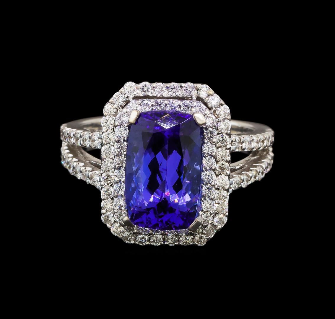 One electronically tested 14KT white gold ladies cast tanzanite and diamond ring with a bright polish finish. Identified with markings of "K14". Condition is new. Containing: One prong set rectangular cushion modified brilliant cut natural tanzanite, measuring 12.10 x 7.60 x 4.94mm, approximate weight of 3.58ct., clarity is eye clean, type I, medium light, very slightly grayish, violet color, (GIA V 4/3), cut is good. Ninety-Four prong set round brilliant cut diamonds, measuring 1.50 - 1.30 x 0.84mm (depth est.) approximate total weight of 94 Stones = 0.94ct. Clarity: SI-1 to I-1. Color: H - I, Cut is Good. Colored gemstones are presumed to have been subjected to commonly used enhancement processes. All diamonds and colored gemstones are graded in the mounting, unless otherwise stated. Total Weight of Colored Stones 3.58ct. Total Weight of Diamonds 0.94ct. Total Weight of Ring 8.30 grams. GGL Appraised at $5,510.00.