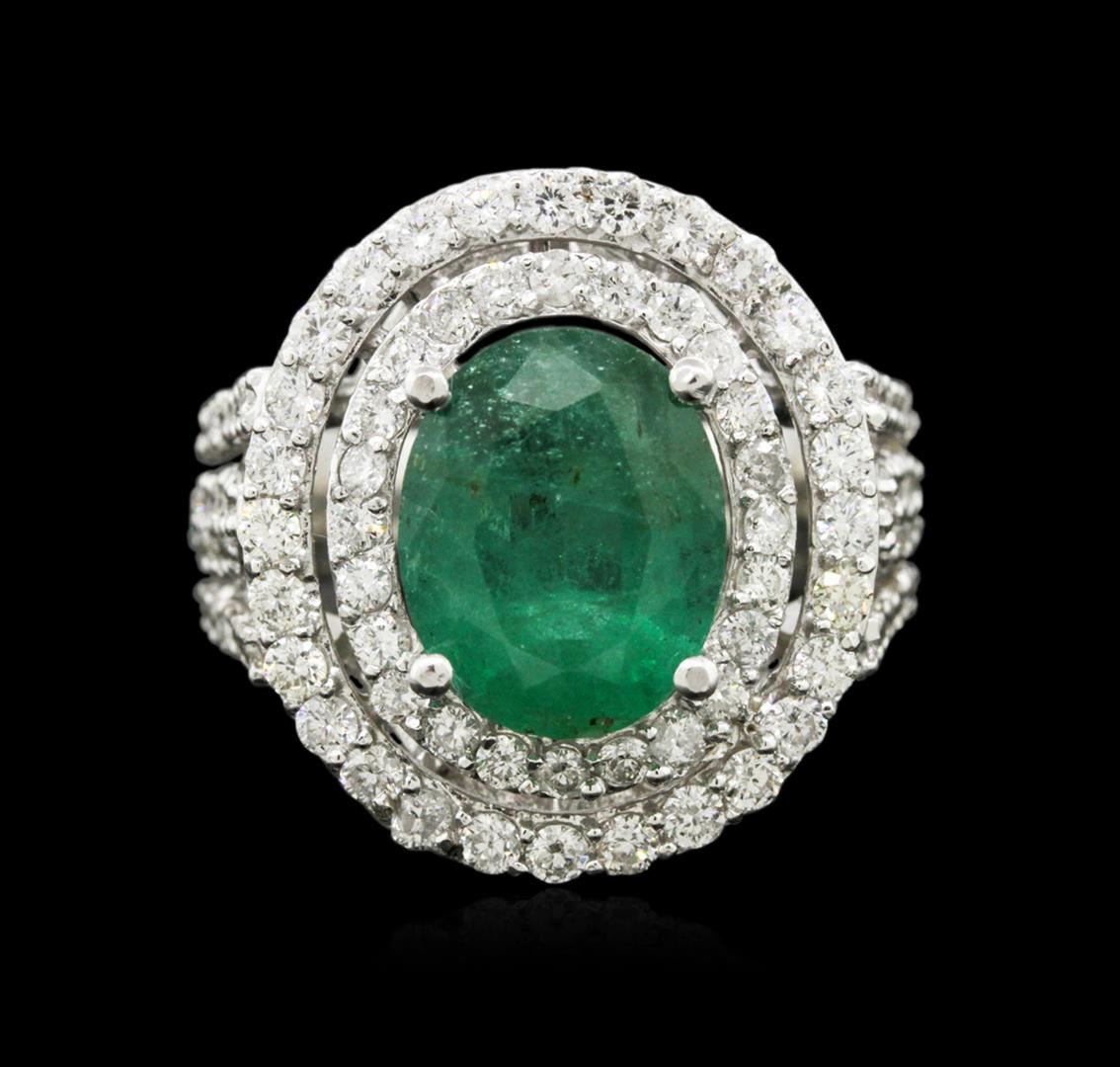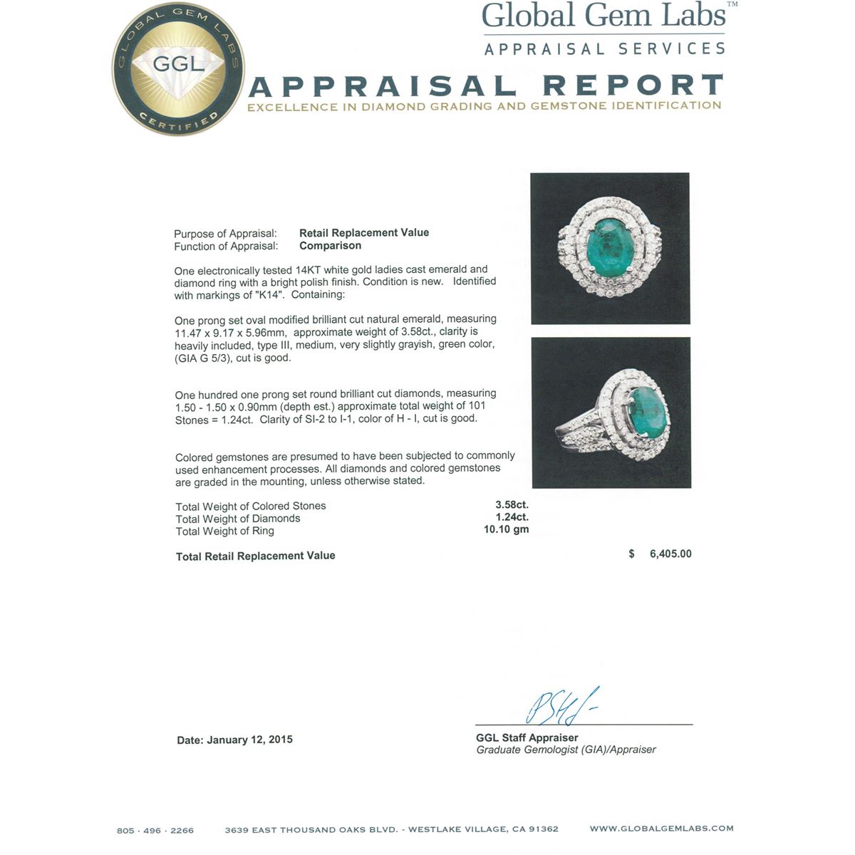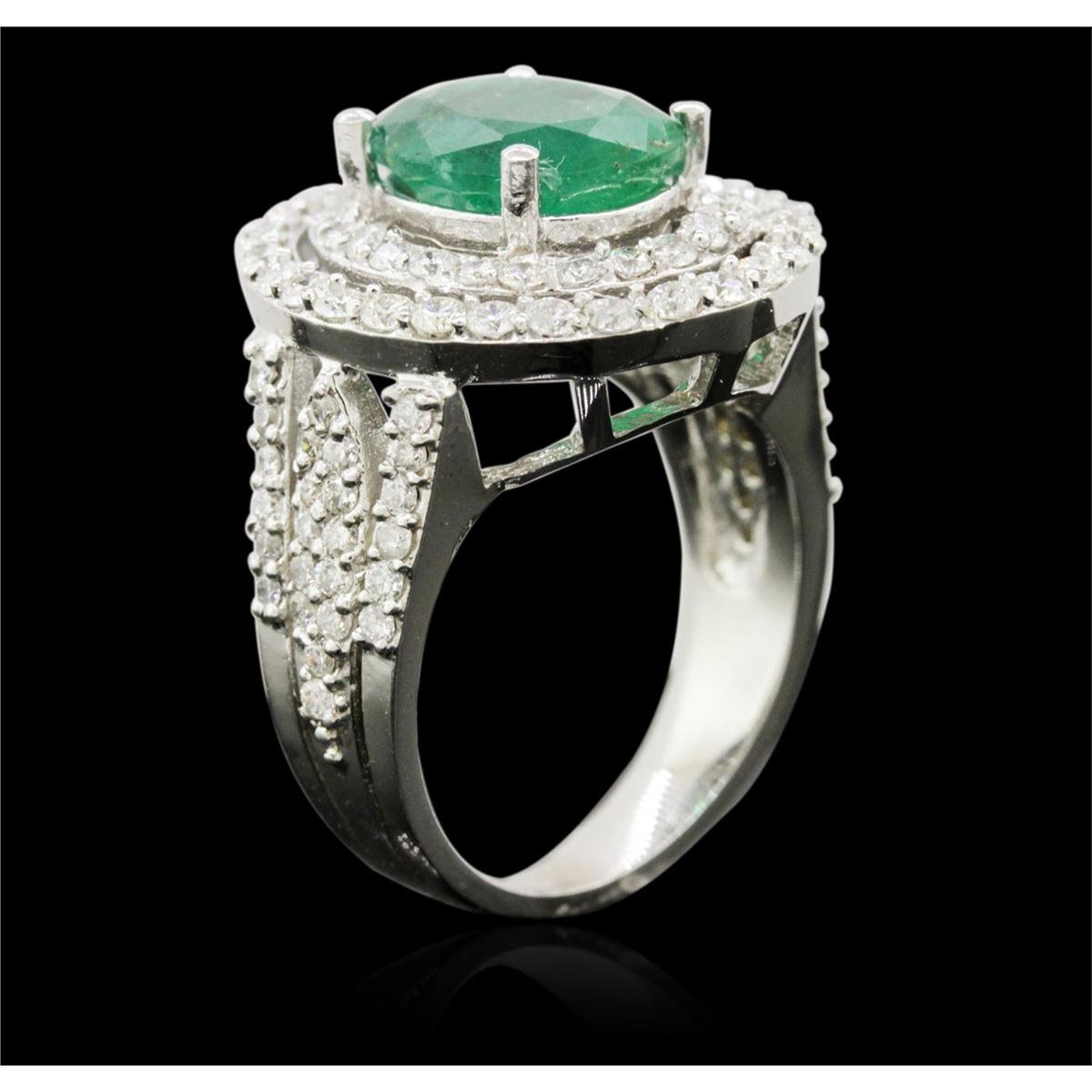 One electronically tested 14KT white gold ladies cast emerald and diamond ring with a bright polish finish. Identified with markings of "K14". Condition is new. Containing: One prong set oval modified brilliant cut natural emerald, measuring 11.47 x 9.17 x 5.96mm, approximate weight of 3.58ct., clarity is heavily included, type III, medium, very slightly grayish, green color, (GIA G 5/3), cut is good. One Hundred One prong set round brilliant cut diamonds, measuring 1.50 - 1.50 x 0.90mm (depth est.) approximate total weight of 101 Stones = 1.24ct. Clarity: SI-2 to I-1. Color: H - I, Cut is Good. Colored gemstones are presumed to have been subjected to commonly used enhancement processes. All diamonds and colored gemstones are graded in the mounting, unless otherwise stated. Total Weight of Colored Stones 3.58ct. Total Weight of Diamonds 1.24ct. Total Weight of Ring 10.10 grams. GGL Appraised at $6,405.00.