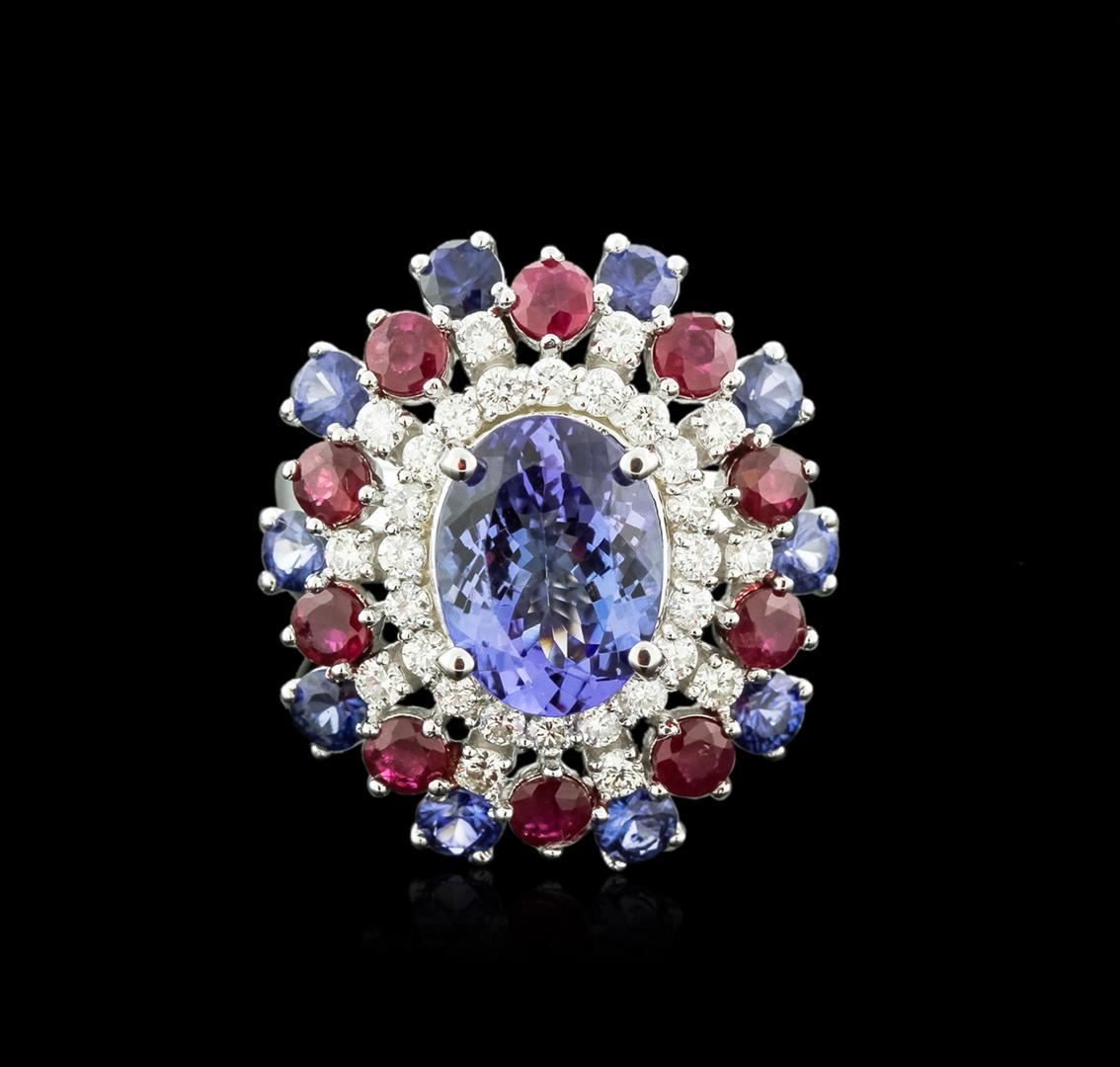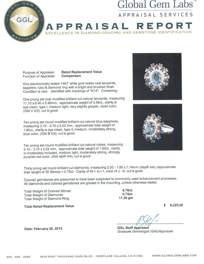 One electronically tested 14KT white gold ladies cast Tanzanite, Sapphire, Ruby and Diamond ring with a bright and brushed finish. Identified with markings of "K14". Condition is new. Containing: One prong set oval modified brilliant cut natural tanzanite, measuring 11.10 x 8.40 x 5.46mm, approximate weight of 3.58ct., clarity is eye clean, type I, medium light, very slightly grayish, violet color, (GIA V 4/3), cut is good. Ten prong set round modified brilliant cut natural blue sapphires, measuring 3.10 - 3.10 x 2.02 mm, approximate total weight of 1.60ct., clarity is eye clean, type II, medium, moderately strong, blue color, (GIA B 5/4), cut is good. Ten prong set round modified brilliant cut natural rubies, measuring 3.10 - 3.10 x 2.02 mm, approximate total weight of 1.60ct., clarity is moderately included, medium light, moderately strong, strongly purplish red color, (GIA stpR 4/4), cut is good. Thirty prong set round brilliant cut diamonds, measuring 2.00 - 1.80 x 1.14mm (depth est.) approximate total weight of 30 Stones = 0.75ct. Clarity: SI-1 to I-1. Color: J - K, Cut is Good. Colored gemstones are presumed to have been subjected to commonly used enhancement processes. All diamonds and colored gemstones are graded in the mounting, unless otherwise stated. Total Weight of Colored Stones 6.78ct. Total Weight of Diamonds 0.75ct. Total Weight of Ring 11.30 grams. GGL Appraised at $6,225.00.
