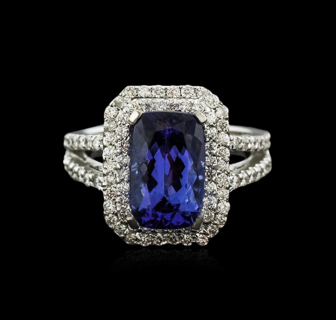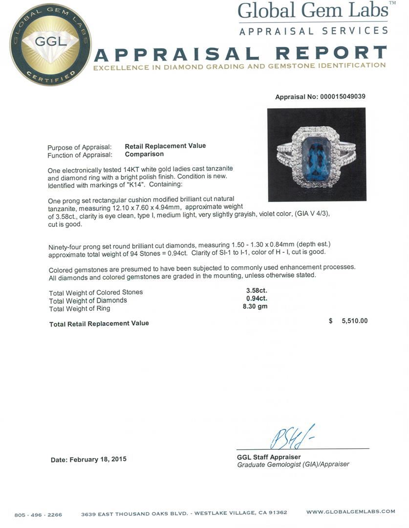One electronically tested 14KT white gold ladies cast tanzanite and diamond ring with a bright polish finish. Identified with markings of "K14". Condition is new. Containing: One prong set rectangular cushion modified brilliant cut natural tanzanite, measuring 12.10 x 7.60 x 4.94mm, approximate weight of 3.58ct., clarity is eye clean, type I, medium light, very slightly grayish, violet color, (GIA V 4/3), cut is good. Ninety-Four prong set round brilliant cut diamonds, measuring 1.50 - 1.30 x 0.84mm (depth est.) approximate total weight of 94 Stones = 0.94ct. Clarity: SI-1 to I-1. Color: H - I, Cut is Good. Colored gemstones are presumed to have been subjected to commonly used enhancement processes. All diamonds and colored gemstones are graded in the mounting, unless otherwise stated. Total Weight of Colored Stones 3.58ct. Total Weight of Diamonds 0.94ct. Total Weight of Ring 8.30 grams. GGL Appraised at $5,510.00.