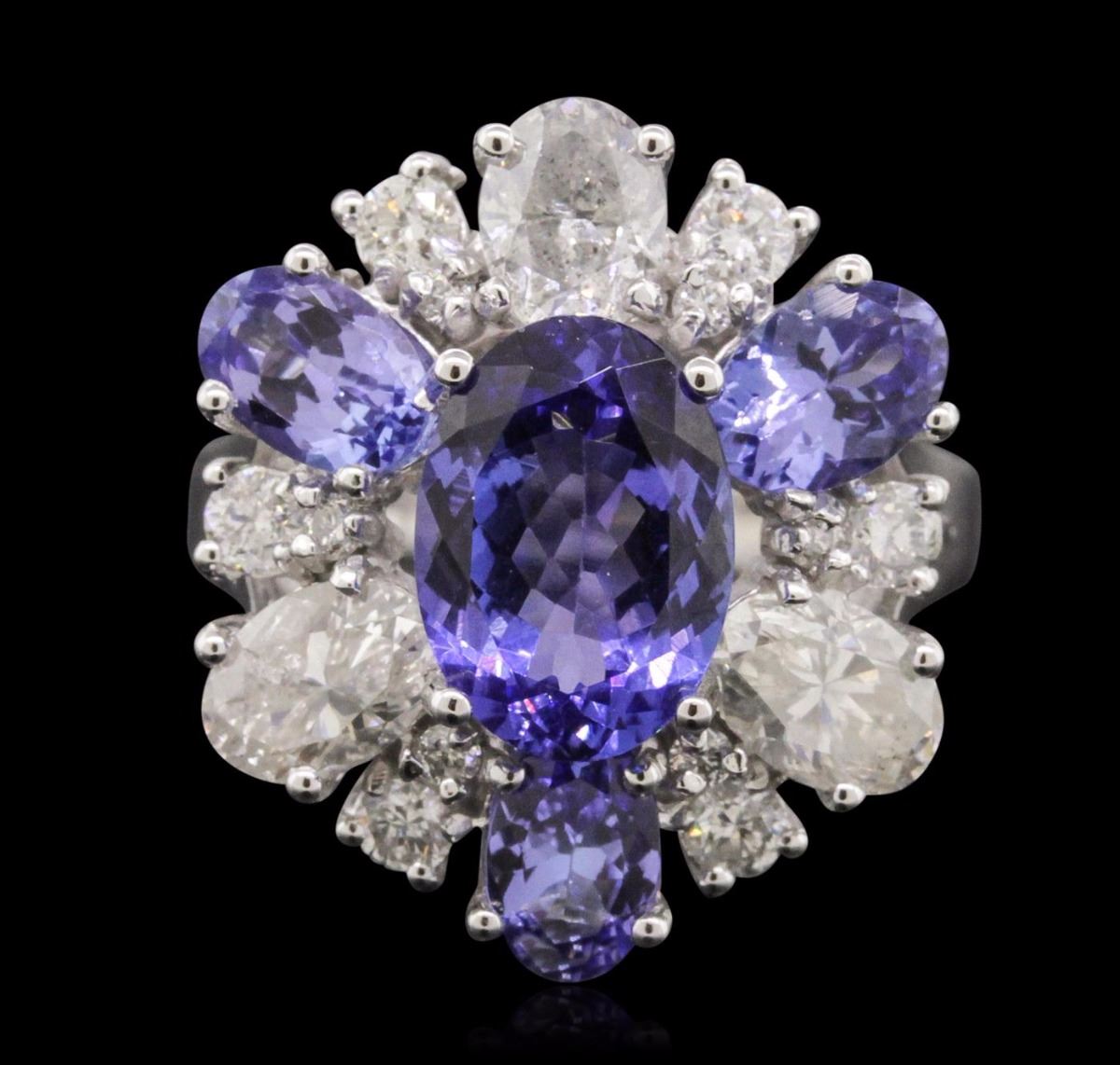 One electronically tested 14KT white gold ladies combination cast & assembled ring with a bright polish finish. Condition is new. Identified with markings of "K14". Containing: One prong set oval modified brilliant cut natural tanzanite, measuring 10.02 x 7.30 x 4.50mm, approximate weight of 2.26ct., clarity is eye clean, type I, medium light, very slightly grayish, bluish violet color, (GIA bV 4/3), cut is good. Three prong set oval modified brilliant cut natural tanzanites, measuring 6.00 x 4.00 x 2.60mm, approximate. Total Weight of 1.32ct., clarity is eye clean, type I, medium light, very slightly grayish, violet color, (GIA V 4/3), cut is good. Three prong set oval shaped cut diamonds, measuring 6.00 x 4.20 x 2.65mm (depth est.) approximate. Total Weight of 3 Stones = 1.28ct. Clarity: I-1 to I-2. Color: I - J, Cut is Good. Twelve prong set round brilliant cut diamonds, measuring 2.10 - 1.50 x 1.08mm (depth est.) approximate. Total Weight of 12 Stones = 0.26ct. Clarity: I-1 to I-2. Color: H - I, Cut is Good. Colored gemstones are presumed to have been subjected to commonly used enhancement processes. All diamonds and colored gemstones are graded in the mounting, unless otherwise stated. Total Weight of Colored Stones 3.58ct. Total Weight of Diamonds 1.54ct. Total Weight of Ring 7.60 grams. GGL Appraised at $11,195.00.