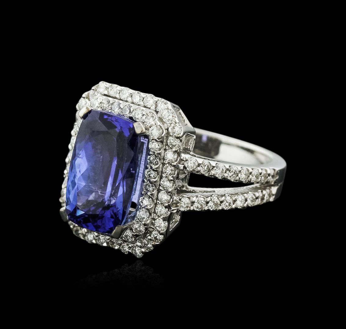 One electronically tested 14KT white gold ladies cast tanzanite and diamond ring with a bright polish finish. Identified with markings of "K14". Condition is new. Containing: One prong set rectangular cushion modified brilliant cut natural tanzanite, measuring 12.10 x 7.60 x 4.94mm, approximate weight of 3.58ct., clarity is eye clean, type I, medium light, very slightly grayish, violet color, (GIA V 4/3), cut is good. Ninety-Four prong set round brilliant cut diamonds, measuring 1.50 - 1.30 x 0.84mm (depth est.) approximate total weight of 94 Stones = 0.94ct. Clarity: SI-1 to I-1. Color: H - I, Cut is Good. Colored gemstones are presumed to have been subjected to commonly used enhancement processes. All diamonds and colored gemstones are graded in the mounting, unless otherwise stated. Total Weight of Colored Stones 3.58ct. Total Weight of Diamonds 0.94ct. Total Weight of Ring 8.30 grams. GGL Appraised at $5,510.00.