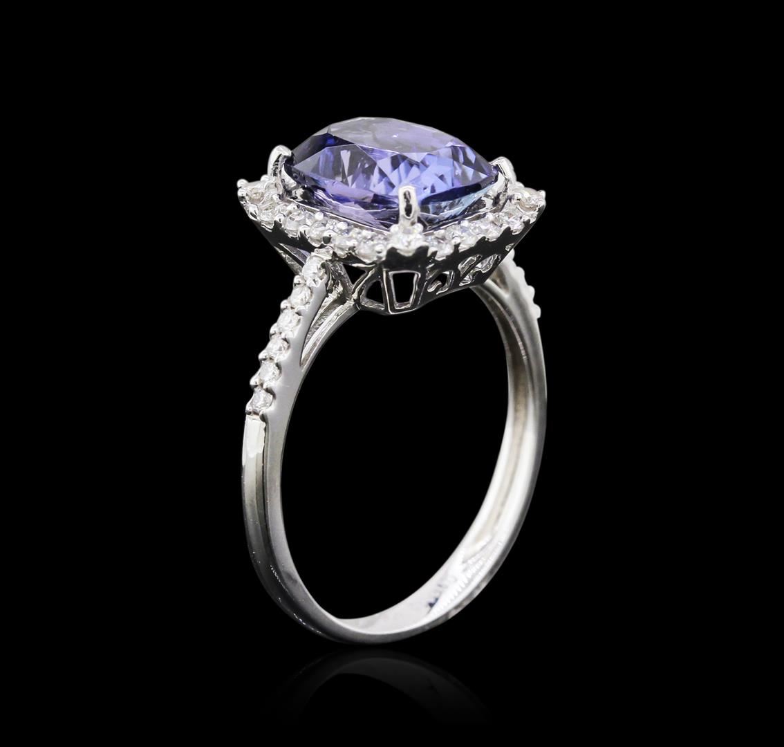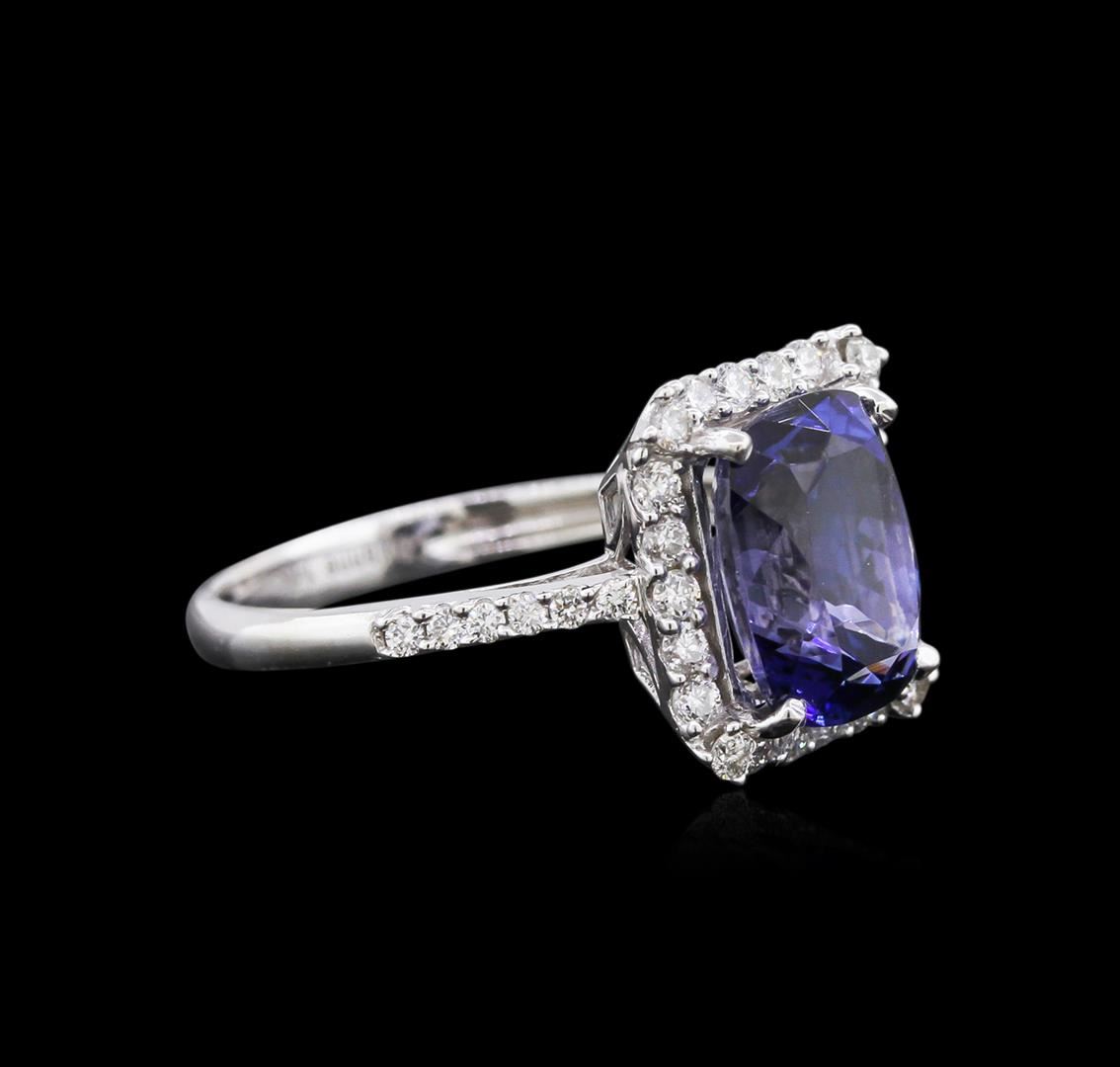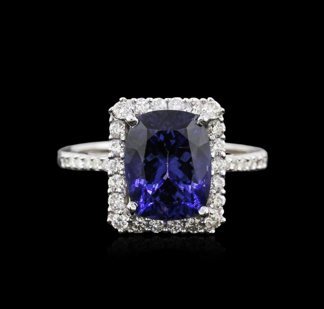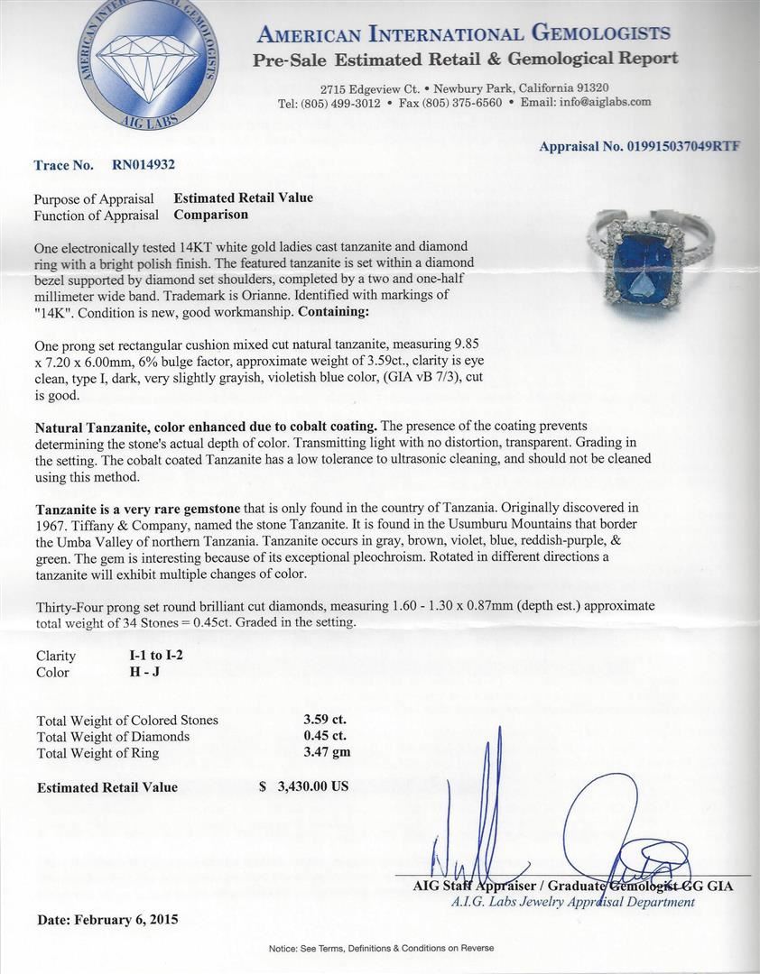 One electronically tested 14KT white gold ladies cast tanzanite and diamond ring with a bright polish finish. The featured tanzanite is set within a diamond bezel supported by diamond set shoulders, completed by a two and one-half millimeter wide band. Trademark is Orianne. Identified with markings of "14K". Condition is new, good workmanship. Containing: One prong set rectangular cushion mixed cut natural tanzanite, measuring 9.85 x 7.20 x 6.00mm, 6% bulge factor, approximate weight of 3.59ct., clarity is eye clean, type I, dark, very slightly grayish, violetish blue color, (GIA vB 7/3), cut is good. Thirty-Four prong set round brilliant cut diamonds, measuring 1.60 - 1.30 x 0.87mm (depth est.) approximate total weight of 34 Stones = 0.45ct. Graded in the setting. Clarity: I-1 to I-2. Color: H - J. Total Weight of Colored Stones: 3.59 ct. Total Weight of Diamonds: 0.45 ct. Total Weight of Ring: 3.47 gm. AIG Appraised at $3,430.00.