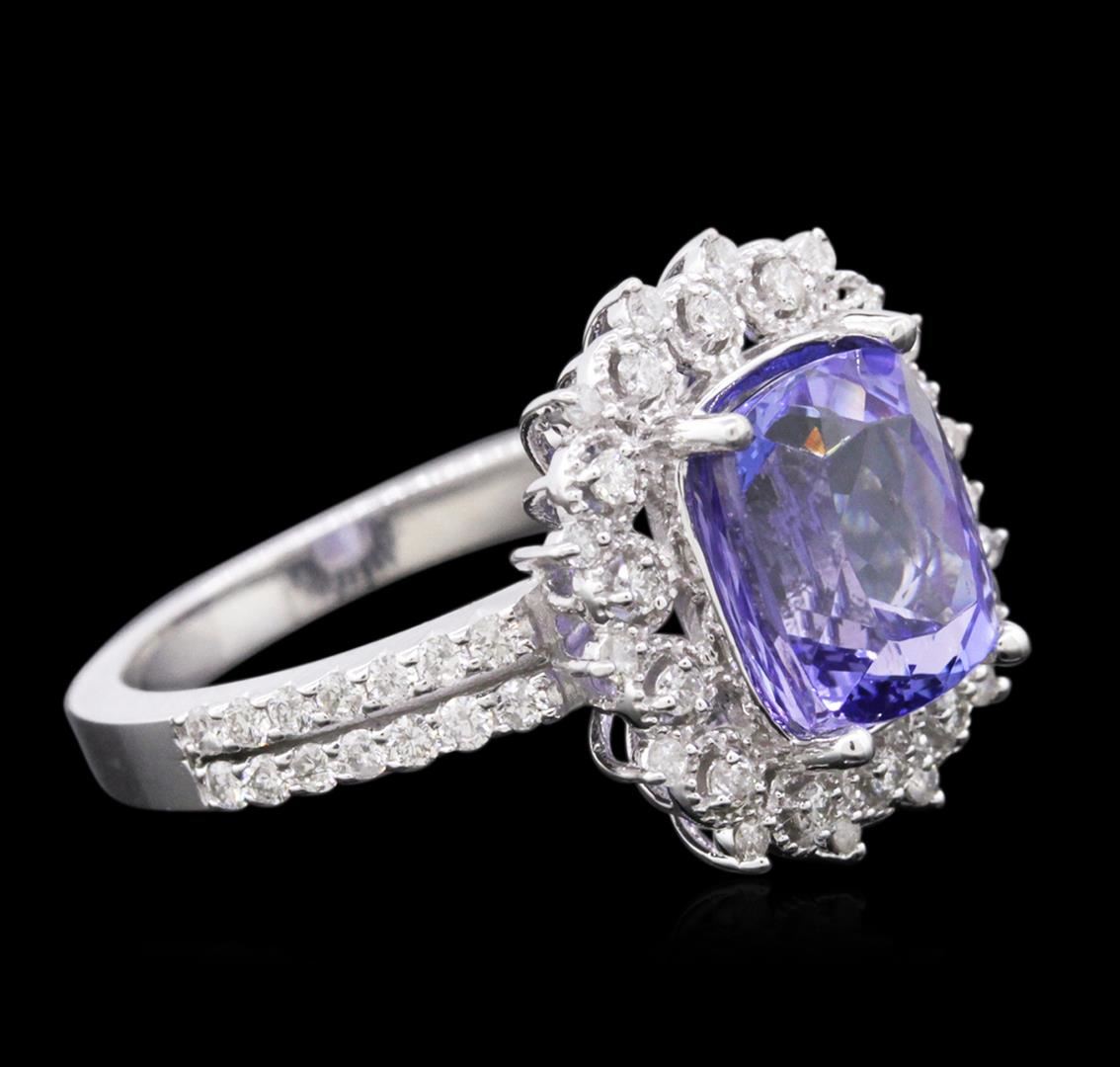 One electronically tested 14KT white gold ladies cast tanzanite and diamond ring with a bright polish finish. Identified with markings of "K14". Condition is new. Containing: One prong set rectangular cushion modified brilliant cut natural tanzanite, measuring 8.87 x 7.83 x 6.59mm, approximate weight of 3.60ct., clarity is eye clean, type I, medium light, very slightly grayish, violet color, (GIA V 4/3), cut is good. Fifty-Six prong set round brilliant cut diamonds, measuring 1.30 - 1.00 x 0.69mm (depth est.) approximate total weight of 56 Stones = 0.31ct. Clarity: SI-2 to I-1. Color: H - I, Cut is Good. Colored gemstones are presumed to have been subjected to commonly used enhancement processes. All diamonds and colored gemstones are graded in the mounting, unless otherwise stated. Total Weight of Colored Stones 3.60ct. Total Weight of Diamonds 0.31ct. Total Weight of Ring 5.70 grams. GGL Appraised at $4,730.00.