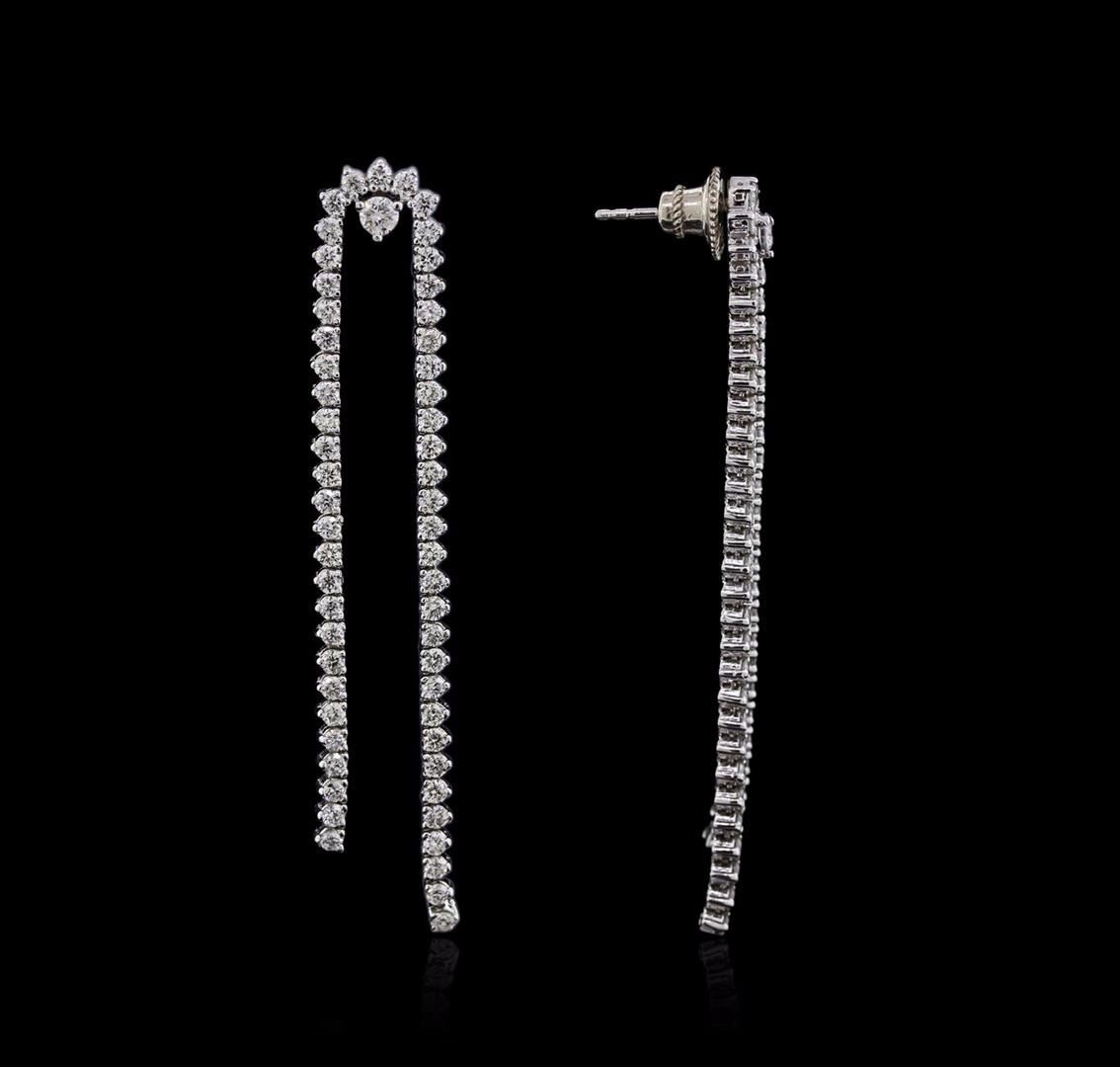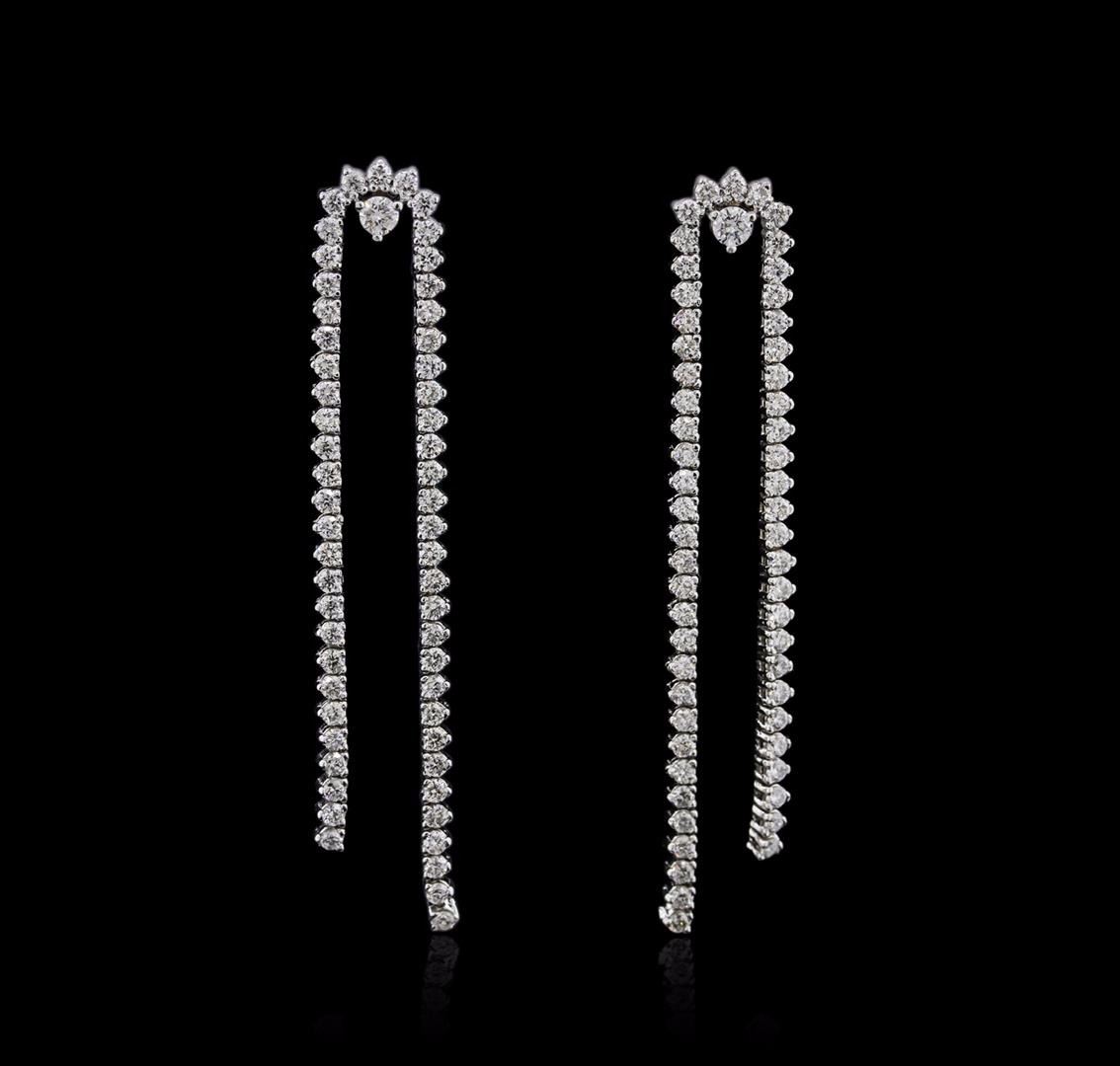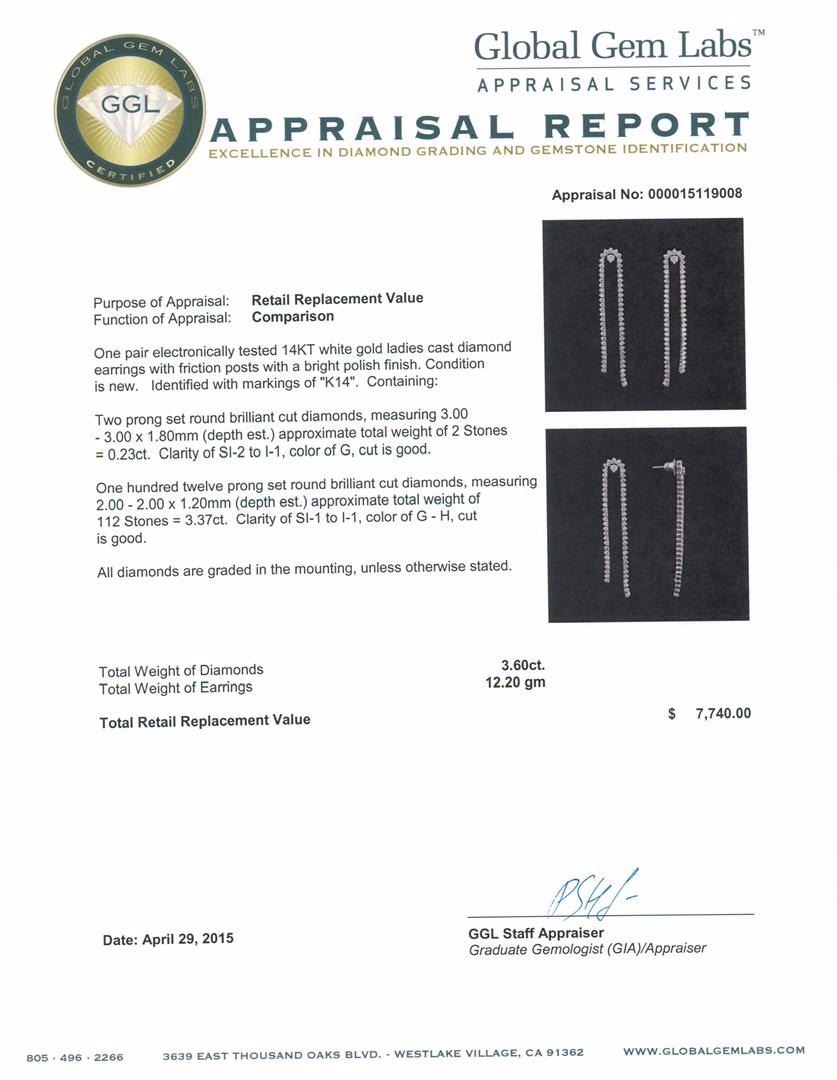 One pair electronically tested 14KT white gold ladies cast diamond earrings with friction posts with a bright polish finish. Identified with markings of "K14". Condition is new. Containing: Two prong set round brilliant cut diamonds, measuring 3.00 - 3.00 x 1.80mm (depth est.) approximate total weight of 2 Stones = 0.23ct. Clarity: SI-2 to I-1. Color: G, Cut is Good. One Hundred Twelve prong set round brilliant cut diamonds, measuring 2.00 - 2.00 x 1.20mm (depth est.) approximate total weight of 112 Stones = 3.37ct. Clarity: SI-1 to I-1. Color: G - H, Cut is Good. All diamonds are graded in the mounting, unless otherwise stated. Total Weight of Diamonds 3.60ct. Total Weight of Earrings 12.20 grams. GGL Appraised at $7,740.00.