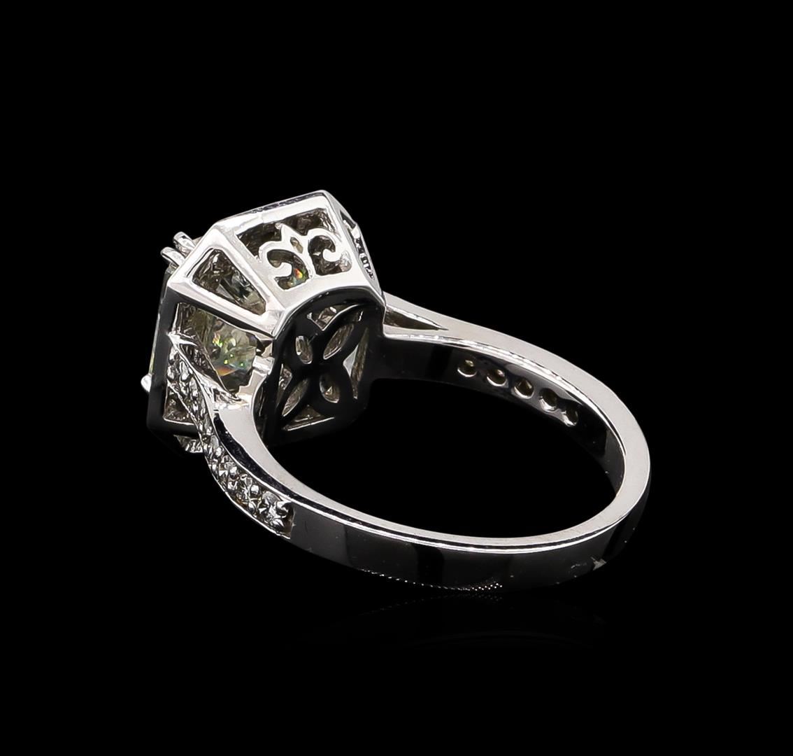 One electronically tested 14KT white gold ladies cast diamond unity ring with a bright polish finish. Condition is new, good workmanship. The featured diamond is set within a diamond lattice gallery, supported by diamond set shoulders and completed by a two millimeter wide band. Identified with markings of "14K". Containing: One prong set radiant shaped cut diamond, measuring 8.50 x 8.25 x 6.19mm (depth est.) approximate weight of 3.62ct with a strong fluorescence. Diamond Grading Report attached. Graded in the setting. Clarity I-1. Color. Depth 75.0%. Table 77.6%. Forty prong set round brilliant cut diamonds, measuring 1.50 - 1.30 x 0.84mm (depth est.) approximate total weight of 40 Stones = 0.49ct. Graded in the setting. Clarity I-1 to 1-2. Color H -- I. Total Weight of Diamonds 4.11ct. Total Weight of Ring 5.00gm. AIG Appraised at $34,250.00.