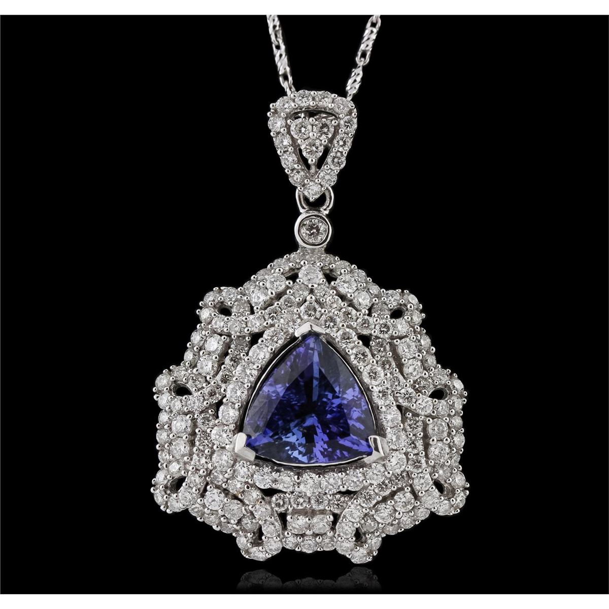 One electronically tested 14KT white gold ladies cast & assembled tanzanite and diamond pendant with chain. The pendant features a tanzanite set within a diamond lattice gallery, completed by a diamond set bail. The pendant is supported by an eighteen inch length 14KT white gold designer style chain, terminating in a lobster claw clasp. Bright polish finish. Trademark is Orianne. Identified with markings of "14K". Condition is new, good workmanship. Containing: One prong set triangle brilliant cut natural tanzanite, measuring 10.10 x 10.00 x 5.60mm, 6% bulge factor, approximate weight of 3.62ct., clarity is slightly included, type I, medium dark, very slightly grayish, violetish blue color, (GIA vB 6/3), cut is good. Transmitting light with a minimum of distortion, transparent, Naturally occurring internal & external characteristics are present. Graded in the setting. Tanzanite is a very rare gemstone that is only found in the country of Tanzania. Originally discovered in 1967. Tiffany & Company, named the stone Tanzanite. It is found in the Usumburu Mountains that border the Umba Valley of northern Tanzania. Tanzanite occurs in gray, brown, violet, blue, reddish-purple, & green. The gem is interesting because of its exceptional pleochroism. Rotated in different directions a tanzanite will exhibit multiple changes of color. Tanzanite has a low tolerance to ultrasonic cleaning, and should not be cleaned using this method. One Hundred Sixty prong set round brilliant cut diamonds, measuring 1.70 - 1.50 x 0.96mm (depth est.) approximate total weight of 160 Stones = 2.30ct. Graded in the setting. Clarity: I-1 to I-2. Color: H - J. Total Weight of Colored Stones 3.62ct. Total Weight of Diamonds 2.30ct. Total Weight of Pendant With Chain 9.94 grams. AIG Appraised at $15,860.00.