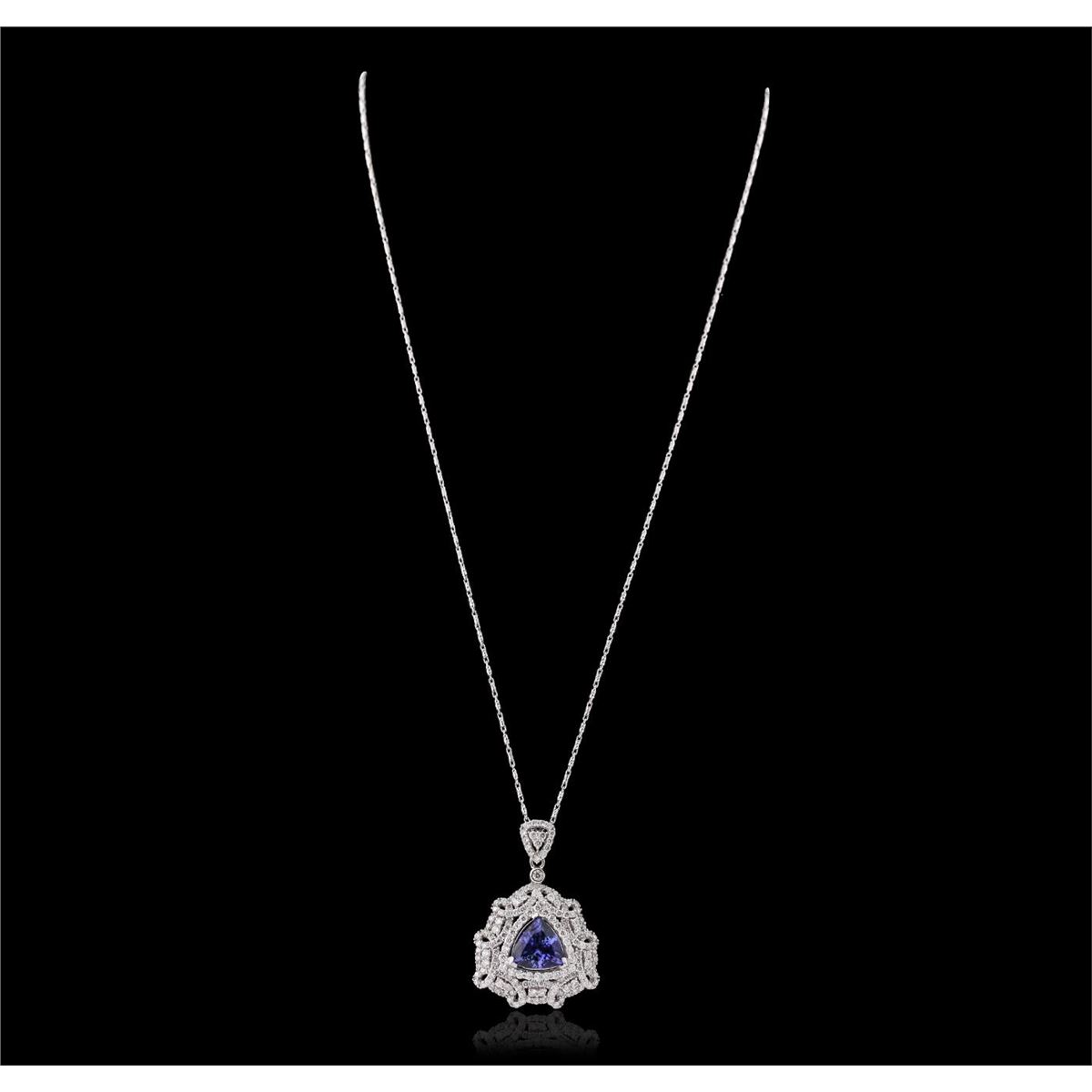 One electronically tested 14KT white gold ladies cast & assembled tanzanite and diamond pendant with chain. The pendant features a tanzanite set within a diamond lattice gallery, completed by a diamond set bail. The pendant is supported by an eighteen inch length 14KT white gold designer style chain, terminating in a lobster claw clasp. Bright polish finish. Trademark is Orianne. Identified with markings of "14K". Condition is new, good workmanship. Containing: One prong set triangle brilliant cut natural tanzanite, measuring 10.10 x 10.00 x 5.60mm, 6% bulge factor, approximate weight of 3.62ct., clarity is slightly included, type I, medium dark, very slightly grayish, violetish blue color, (GIA vB 6/3), cut is good. Transmitting light with a minimum of distortion, transparent, Naturally occurring internal & external characteristics are present. Graded in the setting. Tanzanite is a very rare gemstone that is only found in the country of Tanzania. Originally discovered in 1967. Tiffany & Company, named the stone Tanzanite. It is found in the Usumburu Mountains that border the Umba Valley of northern Tanzania. Tanzanite occurs in gray, brown, violet, blue, reddish-purple, & green. The gem is interesting because of its exceptional pleochroism. Rotated in different directions a tanzanite will exhibit multiple changes of color. Tanzanite has a low tolerance to ultrasonic cleaning, and should not be cleaned using this method. One Hundred Sixty prong set round brilliant cut diamonds, measuring 1.70 - 1.50 x 0.96mm (depth est.) approximate total weight of 160 Stones = 2.30ct. Graded in the setting. Clarity: I-1 to I-2. Color: H - J. Total Weight of Colored Stones 3.62ct. Total Weight of Diamonds 2.30ct. Total Weight of Pendant With Chain 9.94 grams. AIG Appraised at $15,860.00.