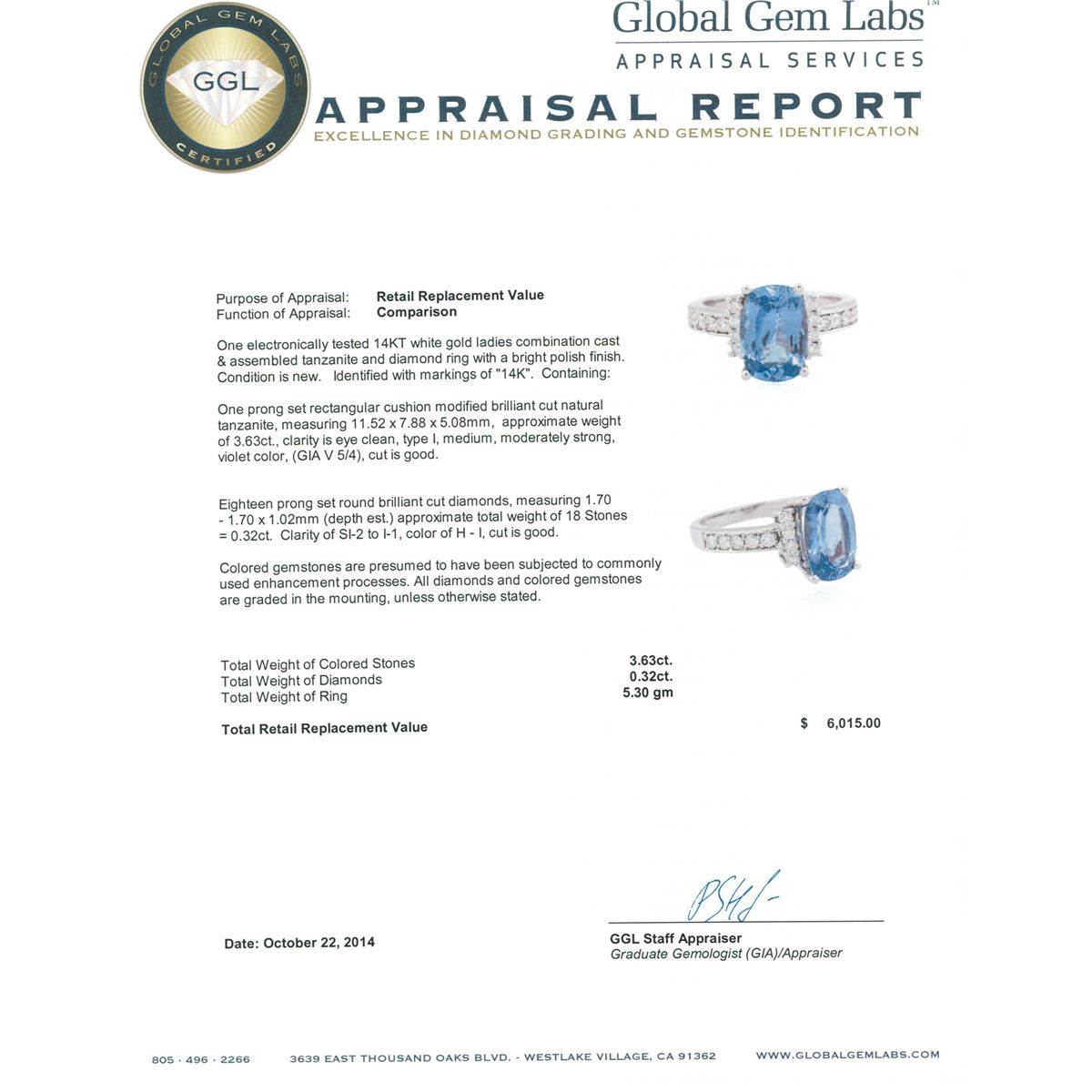 One electronically tested 14KT white gold ladies combination cast & assembled tanzanite and diamond ring with a bright polish finish. Identified with markings of "14K". Condition is new. Containing: One prong set rectangular cushion modified brilliant cut natural tanzanite, measuring 11.52 x 7.88 x 5.08mm, approximate weight of 3.63ct., clarity is eye clean, type I, medium, moderately strong, violet color, (GIA V 5/4), cut is good. Eighteen prong set round brilliant cut diamonds, measuring 1.70 - 1.70 x 1.02mm (depth est.) approximate total weight of 18 Stones = 0.32ct. Clarity: SI-2 to I-1. Color: H - I, Cut is Good. Colored gemstones are presumed to have been subjected to commonly used enhancement processes. All diamonds and colored gemstones are graded in the mounting, unless otherwise stated. Total Weight of Colored Stones 3.63ct. Total Weight of Diamonds 0.32ct. Total Weight of Ring 5.30 grams. GGL Appraised at $6,015.00.