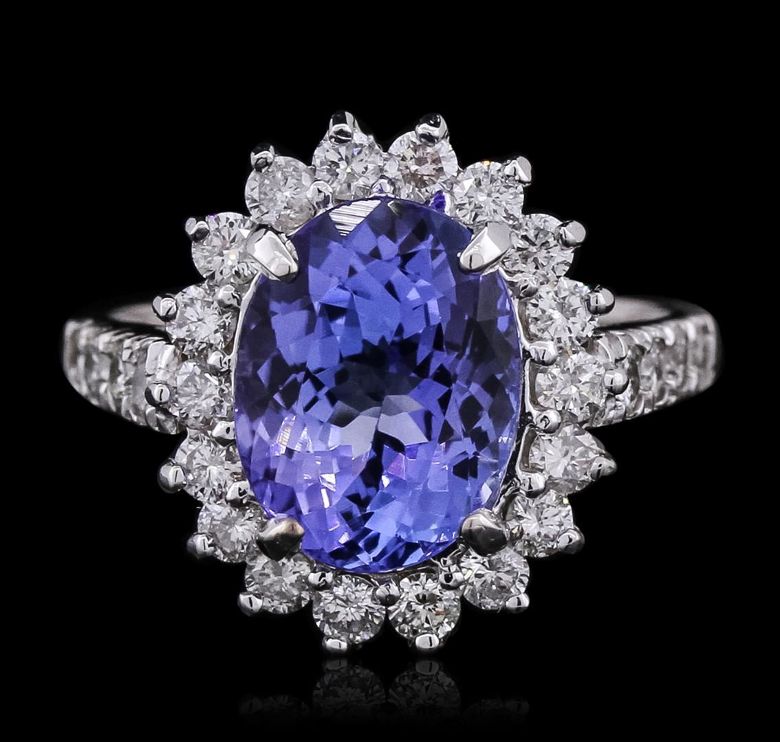 One electronically tested 14KT white gold ladies combination cast & assembled ring with a bright polish finish. Identified with markings of "14K". Condition is new. Containing: One prong set oval modified brilliant cut natural tanzanite, measuring 10.87 x 8.40 x 5.84mm, approximate weight of 3.63ct., clarity is eye clean, type I, medium light, very slightly grayish, violet color, (GIA V 4/3), cut is good. Twenty-Six prong set round brilliant cut diamonds, measuring 2.00 - 2.00 x 1.20mm (depth est.) approximate total weight of 26 Stones = 0.76ct. Clarity: SI-2 to I-1. Color: I - J, Cut is Good. Colored gemstones are presumed to have been subjected to commonly used enhancement processes. All diamonds and colored gemstones are graded in the mounting, unless otherwise stated. Total Weight of Colored Stones 3.63ct. Total Weight of Diamonds 0.76ct. Total Weight of Ring 5.20 grams. GGL Appraised at $8,340.00.