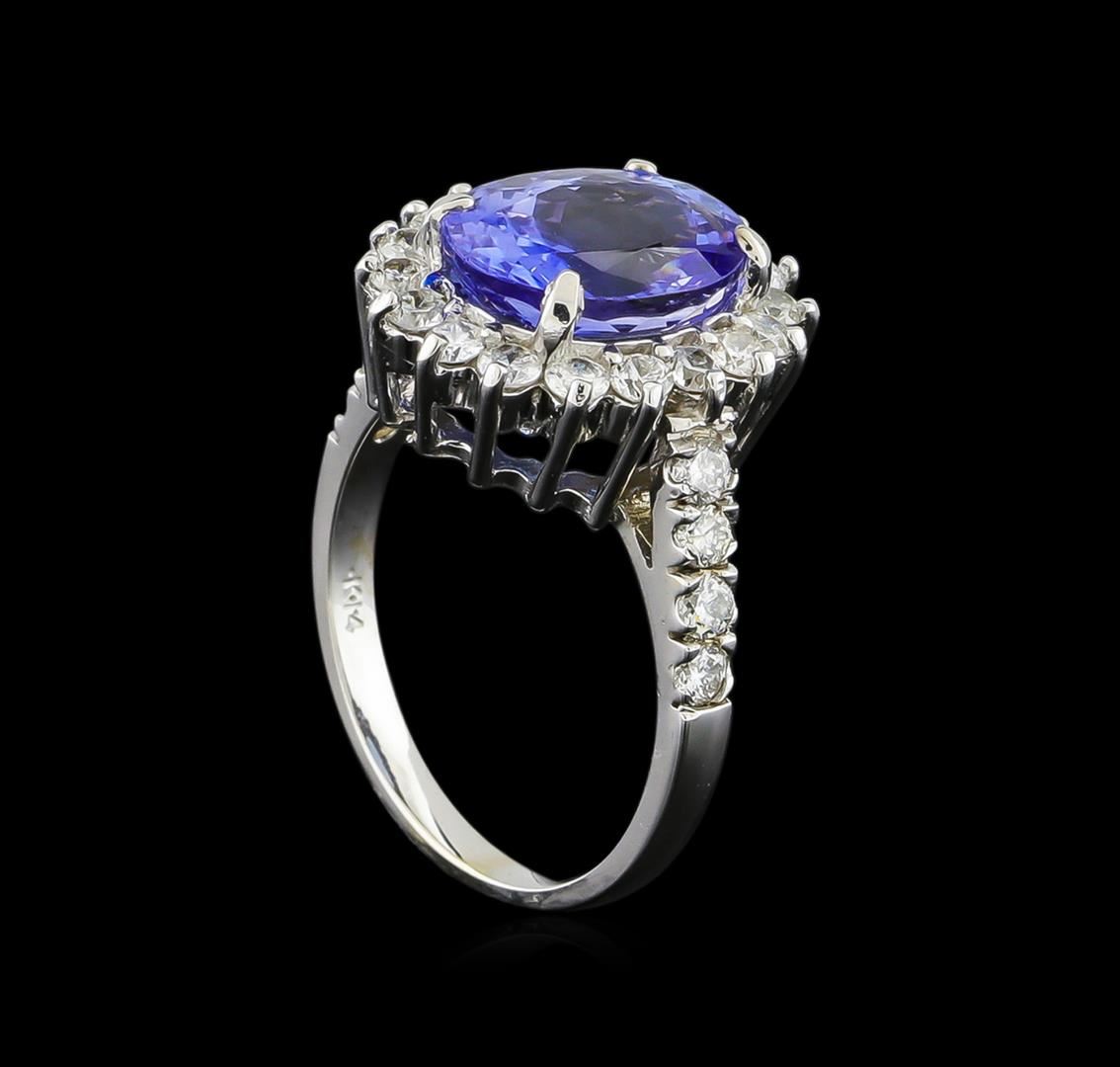 One electronically tested 14KT white gold ladies combination cast & assembled ring with a bright polish finish. Identified with markings of "14K". Condition is new. Containing: One prong set oval modified brilliant cut natural tanzanite, measuring 10.87 x 8.40 x 5.84mm, approximate weight of 3.63ct., clarity is eye clean, type I, medium light, very slightly grayish, violet color, (GIA V 4/3), cut is good. Twenty-Six prong set round brilliant cut diamonds, measuring 2.00 - 2.00 x 1.20mm (depth est.) approximate total weight of 26 Stones = 0.76ct. Clarity: SI-2 to I-1. Color: I - J, Cut is Good. Colored gemstones are presumed to have been subjected to commonly used enhancement processes. All diamonds and colored gemstones are graded in the mounting, unless otherwise stated. Total Weight of Colored Stones 3.63ct. Total Weight of Diamonds 0.76ct. Total Weight of Ring 5.20 grams. GGL Appraised at $8,340.00.