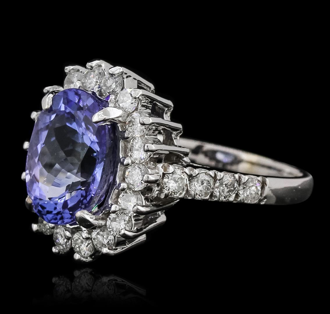 One electronically tested 14KT white gold ladies combination cast & assembled ring with a bright polish finish. Identified with markings of "14K". Condition is new. Containing: One prong set oval modified brilliant cut natural tanzanite, measuring 10.87 x 8.40 x 5.84mm, approximate weight of 3.63ct., clarity is eye clean, type I, medium light, very slightly grayish, violet color, (GIA V 4/3), cut is good. Twenty-Six prong set round brilliant cut diamonds, measuring 2.00 - 2.00 x 1.20mm (depth est.) approximate total weight of 26 Stones = 0.76ct. Clarity: SI-2 to I-1. Color: I - J, Cut is Good. Colored gemstones are presumed to have been subjected to commonly used enhancement processes. All diamonds and colored gemstones are graded in the mounting, unless otherwise stated. Total Weight of Colored Stones 3.63ct. Total Weight of Diamonds 0.76ct. Total Weight of Ring 5.20 grams. GGL Appraised at $8,340.00.