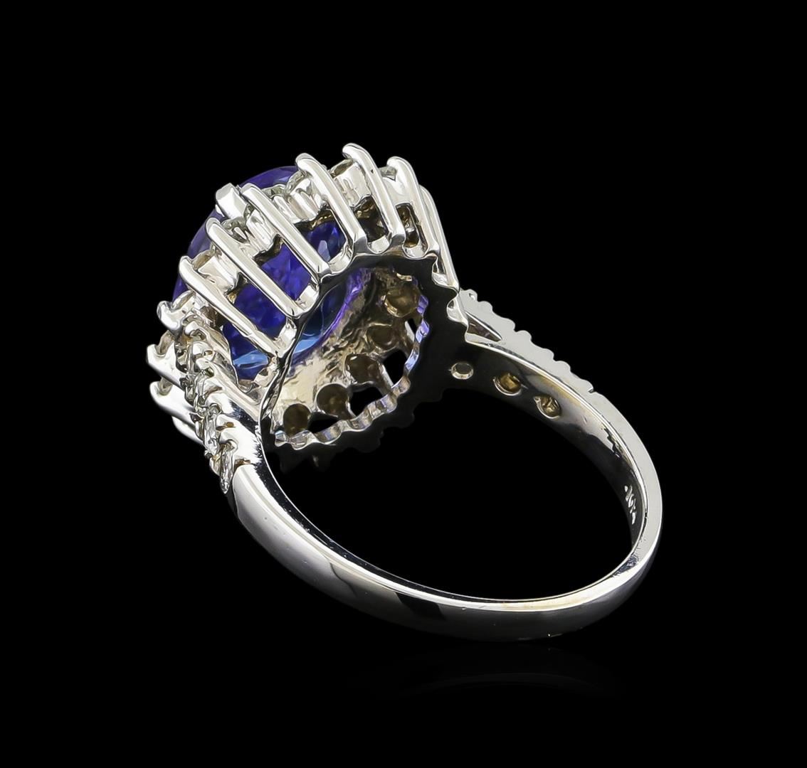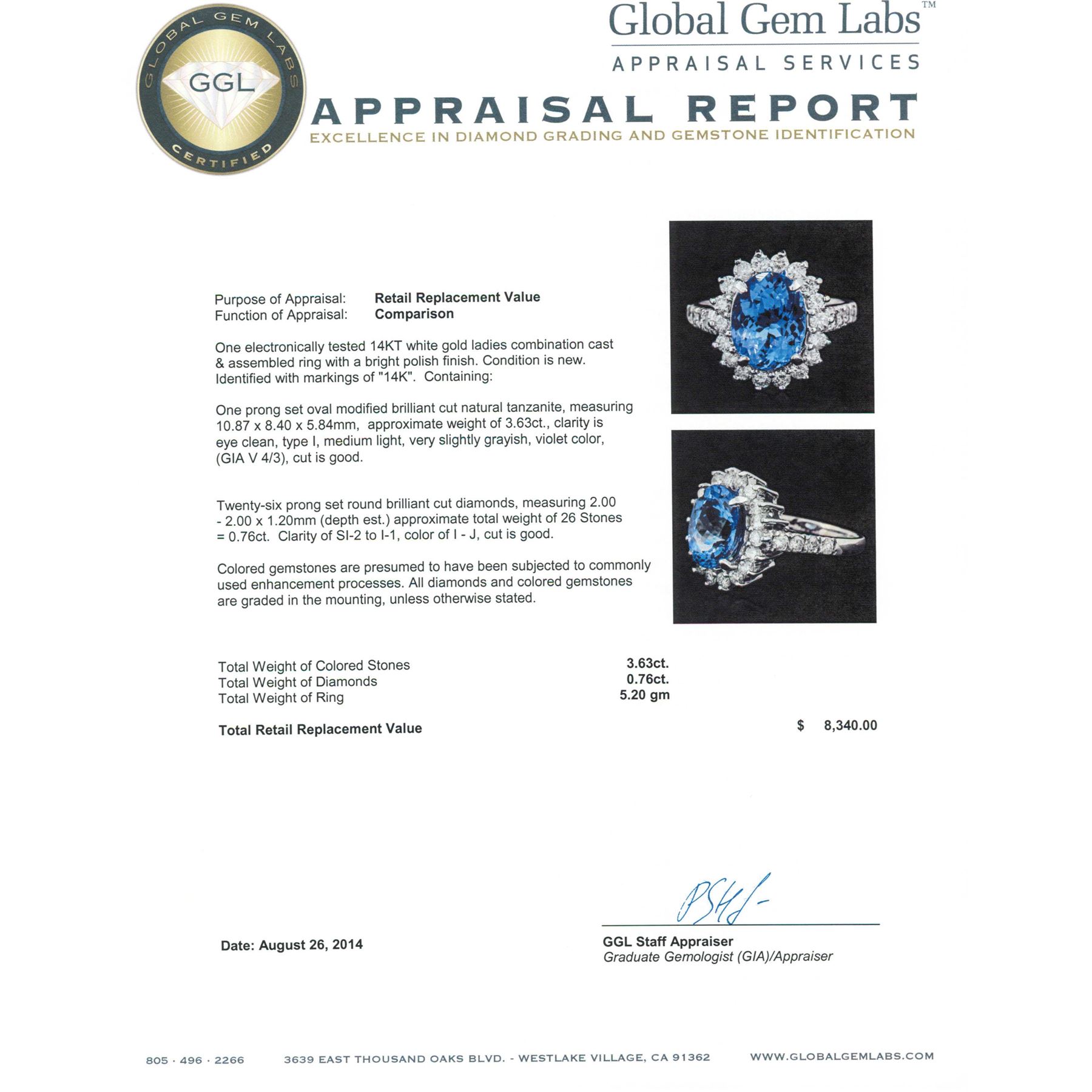 One electronically tested 14KT white gold ladies combination cast & assembled ring with a bright polish finish. Identified with markings of "14K". Condition is new. Containing: One prong set oval modified brilliant cut natural tanzanite, measuring 10.87 x 8.40 x 5.84mm, approximate weight of 3.63ct., clarity is eye clean, type I, medium light, very slightly grayish, violet color, (GIA V 4/3), cut is good. Twenty-Six prong set round brilliant cut diamonds, measuring 2.00 - 2.00 x 1.20mm (depth est.) approximate total weight of 26 Stones = 0.76ct. Clarity: SI-2 to I-1. Color: I - J, Cut is Good. Colored gemstones are presumed to have been subjected to commonly used enhancement processes. All diamonds and colored gemstones are graded in the mounting, unless otherwise stated. Total Weight of Colored Stones 3.63ct. Total Weight of Diamonds 0.76ct. Total Weight of Ring 5.20 grams. GGL Appraised at $8,340.00.