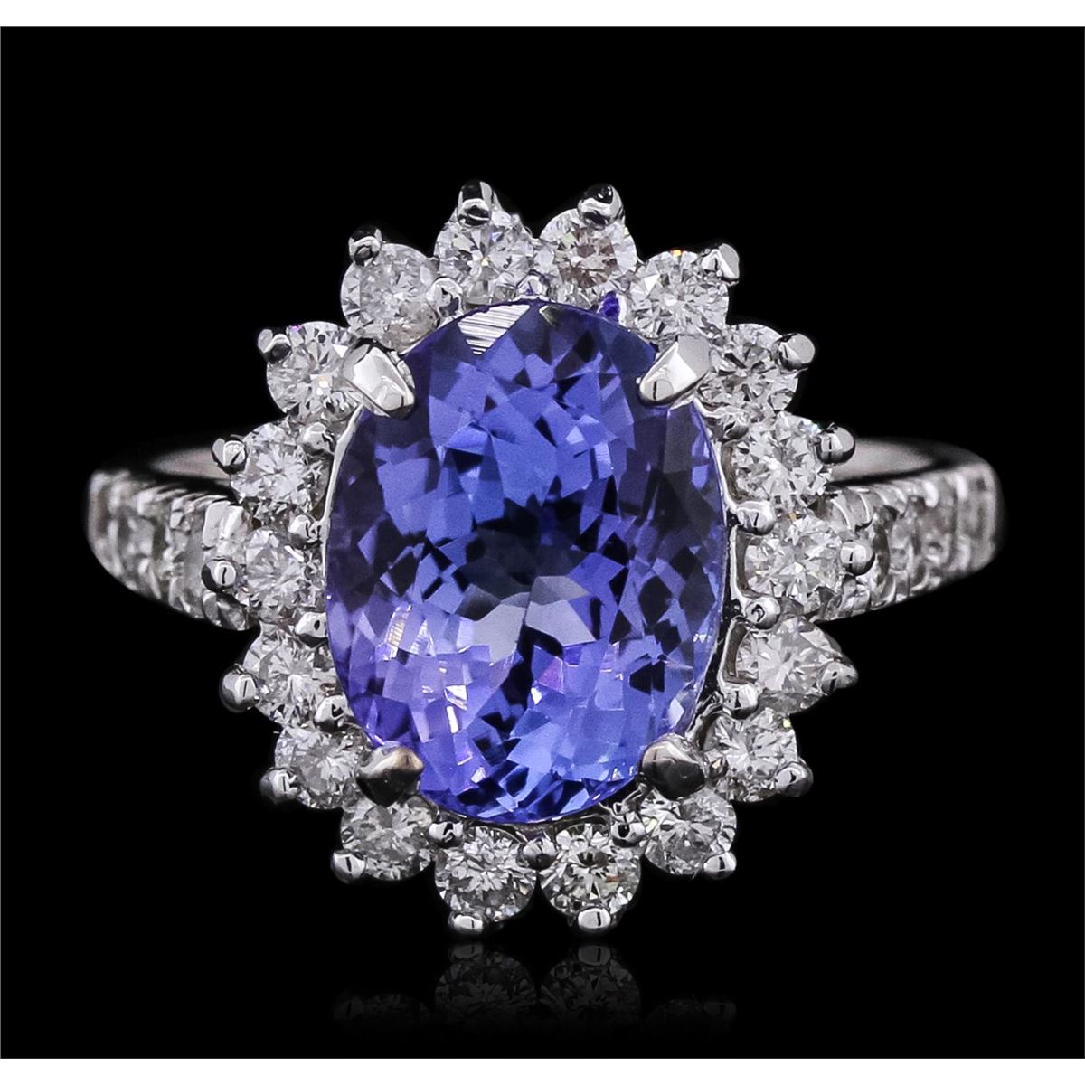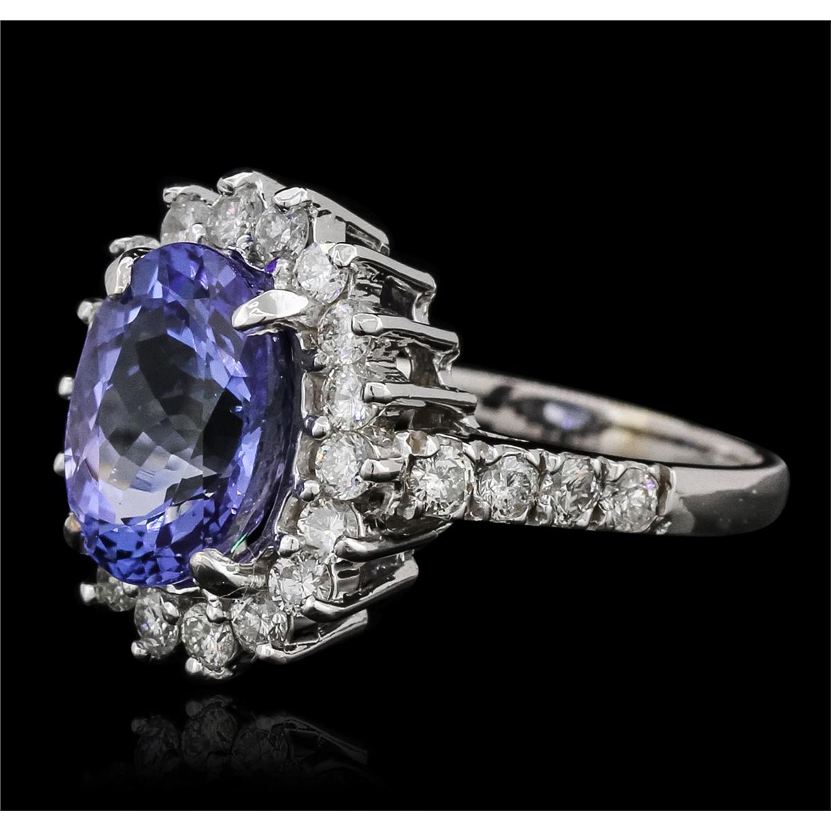 One electronically tested 14KT white gold ladies combination cast & assembled ring with a bright polish finish. Identified with markings of "14K". Condition is new. Containing: One prong set oval modified brilliant cut natural tanzanite, measuring 10.87 x 8.40 x 5.84mm, approximate weight of 3.63ct., clarity is eye clean, type I, medium light, very slightly grayish, violet color, (GIA V 4/3), cut is good. Twenty-Six prong set round brilliant cut diamonds, measuring 2.00 - 2.00 x 1.20mm (depth est.) approximate total weight of 26 Stones = 0.76ct. Clarity: SI-2 to I-1. Color: I - J, Cut is Good. Colored gemstones are presumed to have been subjected to commonly used enhancement processes. All diamonds and colored gemstones are graded in the mounting, unless otherwise stated. Total Weight of Colored Stones 3.63ct. Total Weight of Diamonds 0.76ct. Total Weight of Ring 5.20 grams. GGL Appraised at $8,340.00.