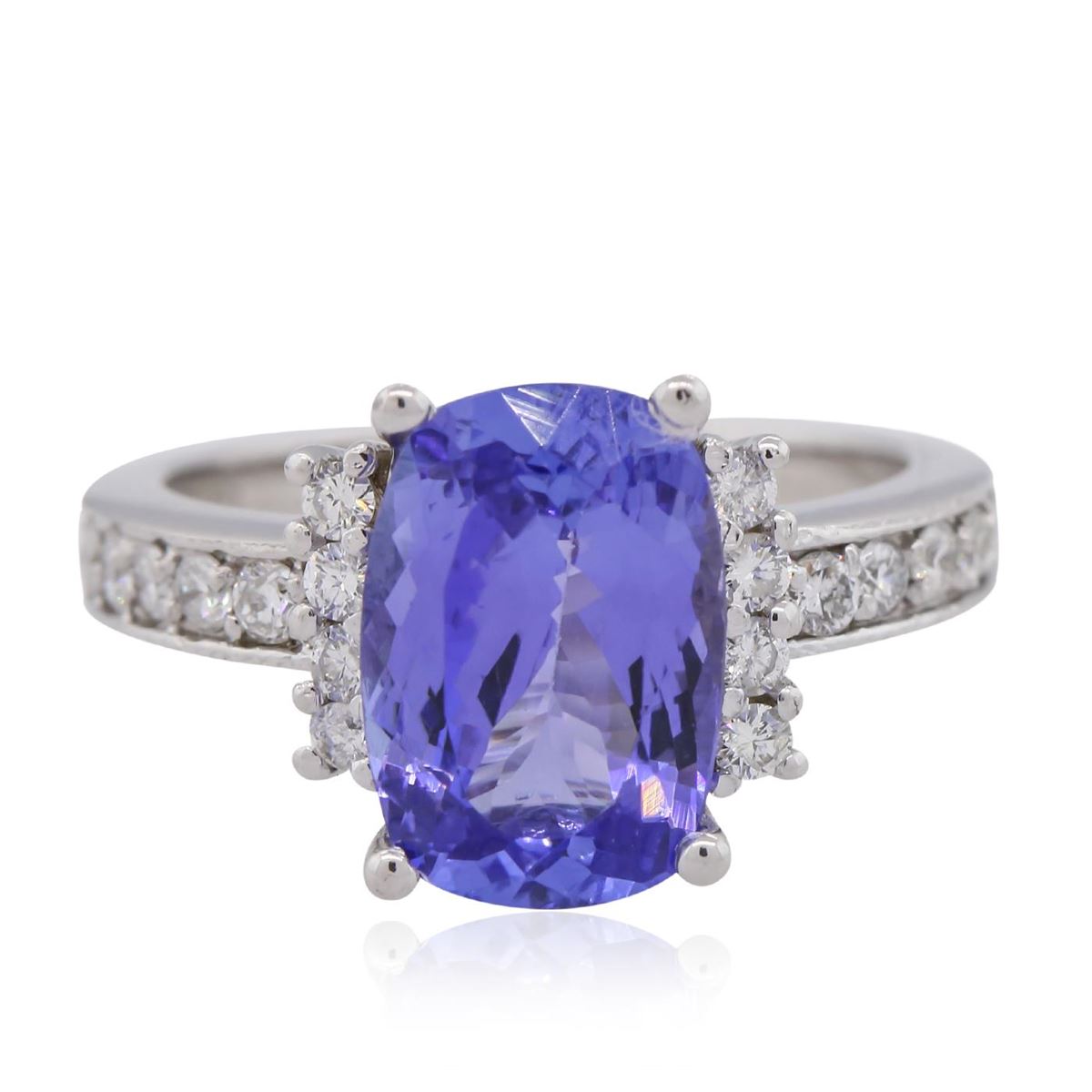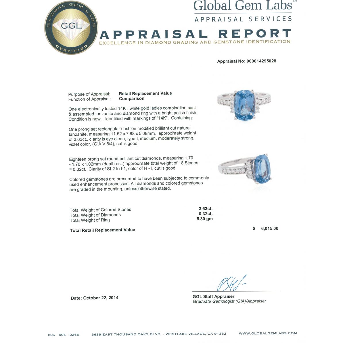 One electronically tested 14KT white gold ladies combination cast & assembled tanzanite and diamond ring with a bright polish finish. Identified with markings of "14K". Condition is new. Containing: One prong set rectangular cushion modified brilliant cut natural tanzanite, measuring 11.52 x 7.88 x 5.08mm, approximate weight of 3.63ct., clarity is eye clean, type I, medium, moderately strong, violet color, (GIA V 5/4), cut is good. Eighteen prong set round brilliant cut diamonds, measuring 1.70 - 1.70 x 1.02mm (depth est.) approximate total weight of 18 Stones = 0.32ct. Clarity: SI-2 to I-1. Color: H - I, Cut is Good. Colored gemstones are presumed to have been subjected to commonly used enhancement processes. All diamonds and colored gemstones are graded in the mounting, unless otherwise stated. Total Weight of Colored Stones 3.63ct. Total Weight of Diamonds 0.32ct. Total Weight of Ring 5.30 grams. GGL Appraised at $6,015.00.