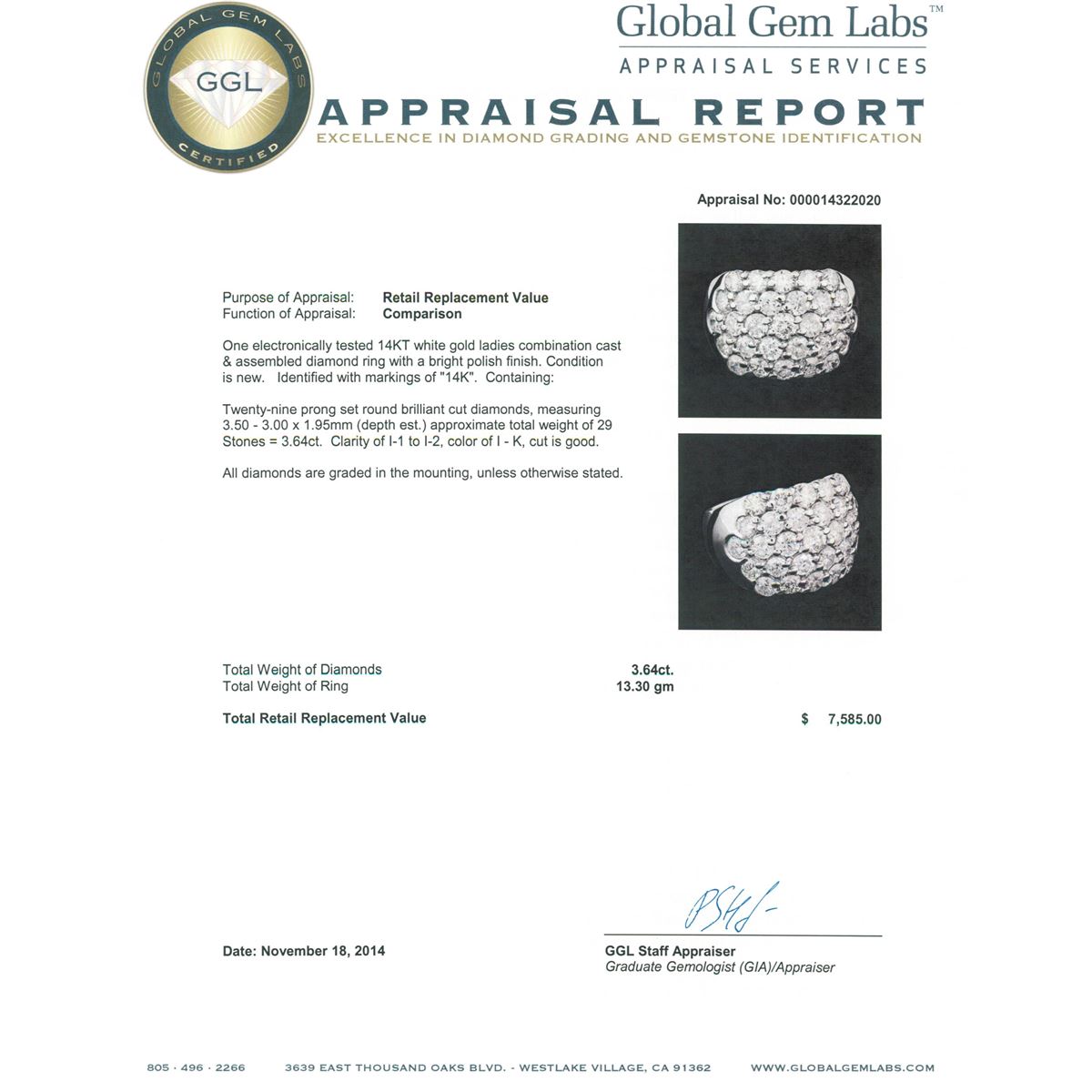 One electronically tested 14KT white gold ladies combination cast & assembled diamond ring with a bright polish finish. Identified with markings of "14K". Condition is new. Containing: Twenty-Nine prong set round brilliant cut diamonds, measuring 3.50 - 3.00 x 1.95mm (depth est.) approximate total weight of 29 Stones = 3.64ct. Clarity: I-1 to I-2. Color: I - K, Cut is Good. All diamonds are graded in the mounting, unless otherwise stated. Total Weight of Diamonds 3.64ct. Total Weight of Ring 13.30 grams. GGL Appraised at $7,585.00.