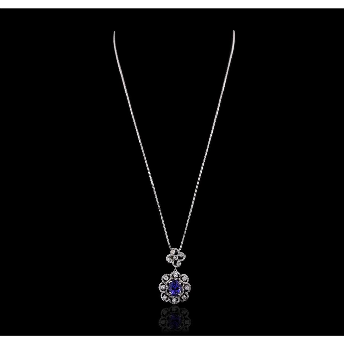 One electronically tested 14KT white gold ladies combination cast & assembled pendant & chain 17.0" long, small cable link with a lobster claw clasp with a bright polish finish. Condition is new. Identified with markings of "K14". Containing: One prong set oval modified brilliant cut natural tanzanite, measuring 10.70 x 8.80 x 5.72mm, approximate weight of 3.64ct., clarity is eye clean, type I, medium, moderately strong, bluish violet color, (GIA bV 5/4), cut is good. One Hundred Fourteen prong set round brilliant cut diamonds, measuring 1.30 - 1.30 x 0.78mm (depth est.) approximate. Total Weight of 114 Stones = 0.91ct. Clarity: I-1 to I-2. Color: I - J, Cut is Good. Thirteen prong set round brilliant cut diamonds, measuring 2.90 - 2.90 x 1.74mm (depth est.) approximate. Total Weight of 13 Stones = 1.16ct. Clarity: I-1 to I-2. Color: I - J, Cut is Good. Colored gemstones are presumed to have been subjected to commonly used enhancement processes. All diamonds and colored gemstones are graded in the mounting, unless otherwise stated. Total Weight of Colored Stones 3.64ct. Total Weight of Diamonds 2.07ct. Total Weight of Pendant & Chain 10.10 grams. GGL Appraised at $11,510.00.