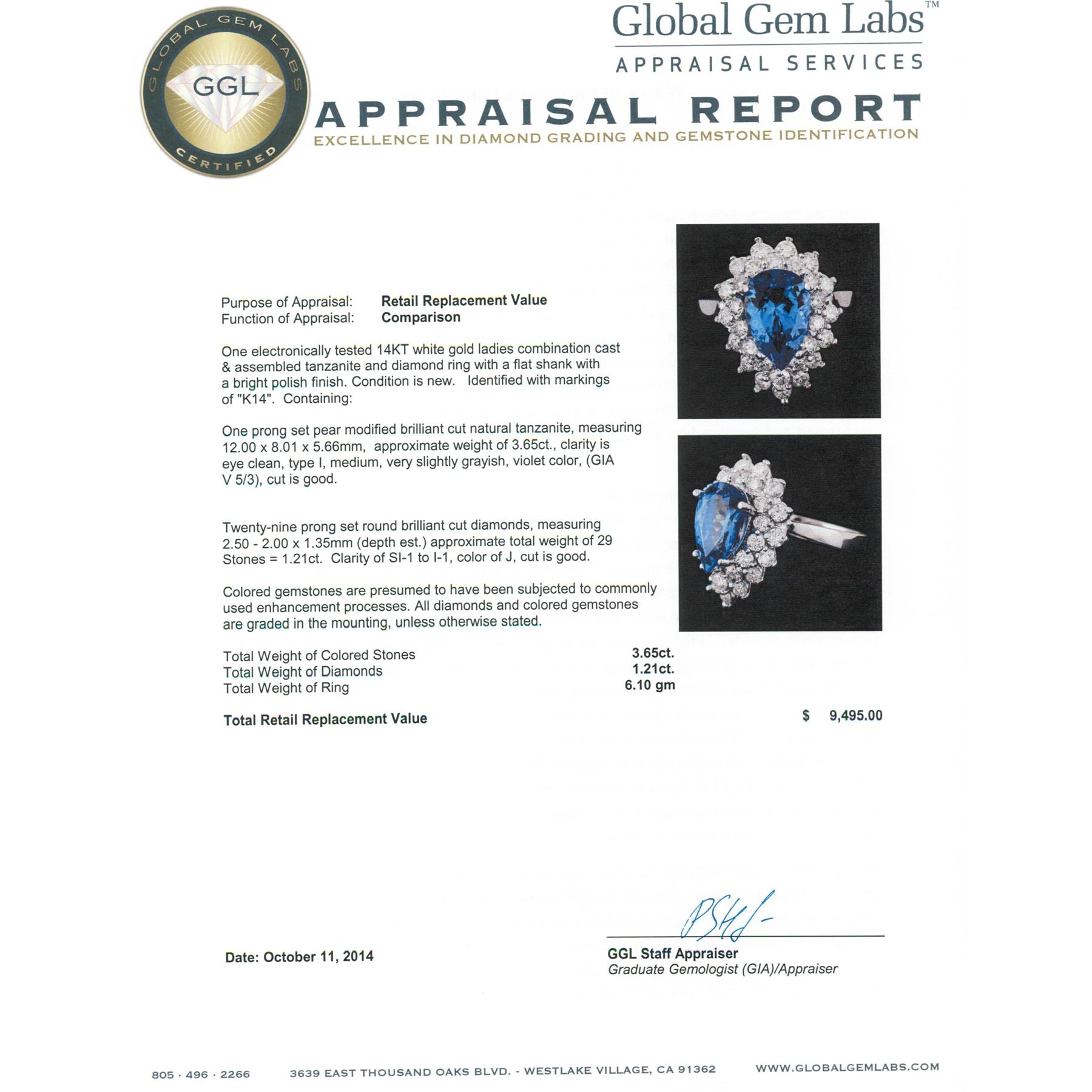 One electronically tested 14KT white gold ladies combination cast & assembled tanzanite and diamond ring with a flat shank with a bright polish finish. Identified with markings of "K14". Condition is new. Containing: One prong set pear modified brilliant cut natural tanzanite, measuring 12.00 x 8.01 x 5.66mm, approximate weight of 3.65ct., clarity is eye clean, type I, medium, very slightly grayish, violet color, (GIA V 5/3), cut is good. Twenty-Nine prong set round brilliant cut diamonds, measuring 2.50 - 2.00 x 1.35mm (depth est.) approximate total weight of 29 Stones = 1.21ct. Clarity: SI-1 to I-1. Color: J, Cut is Good. Colored gemstones are presumed to have been subjected to commonly used enhancement processes. All diamonds and colored gemstones are graded in the mounting, unless otherwise stated. Total Weight of Colored Stones 3.65ct. Total Weight of Diamonds 1.21ct. Total Weight of Ring 6.10 grams. GGL Appraised at $9,495.00.