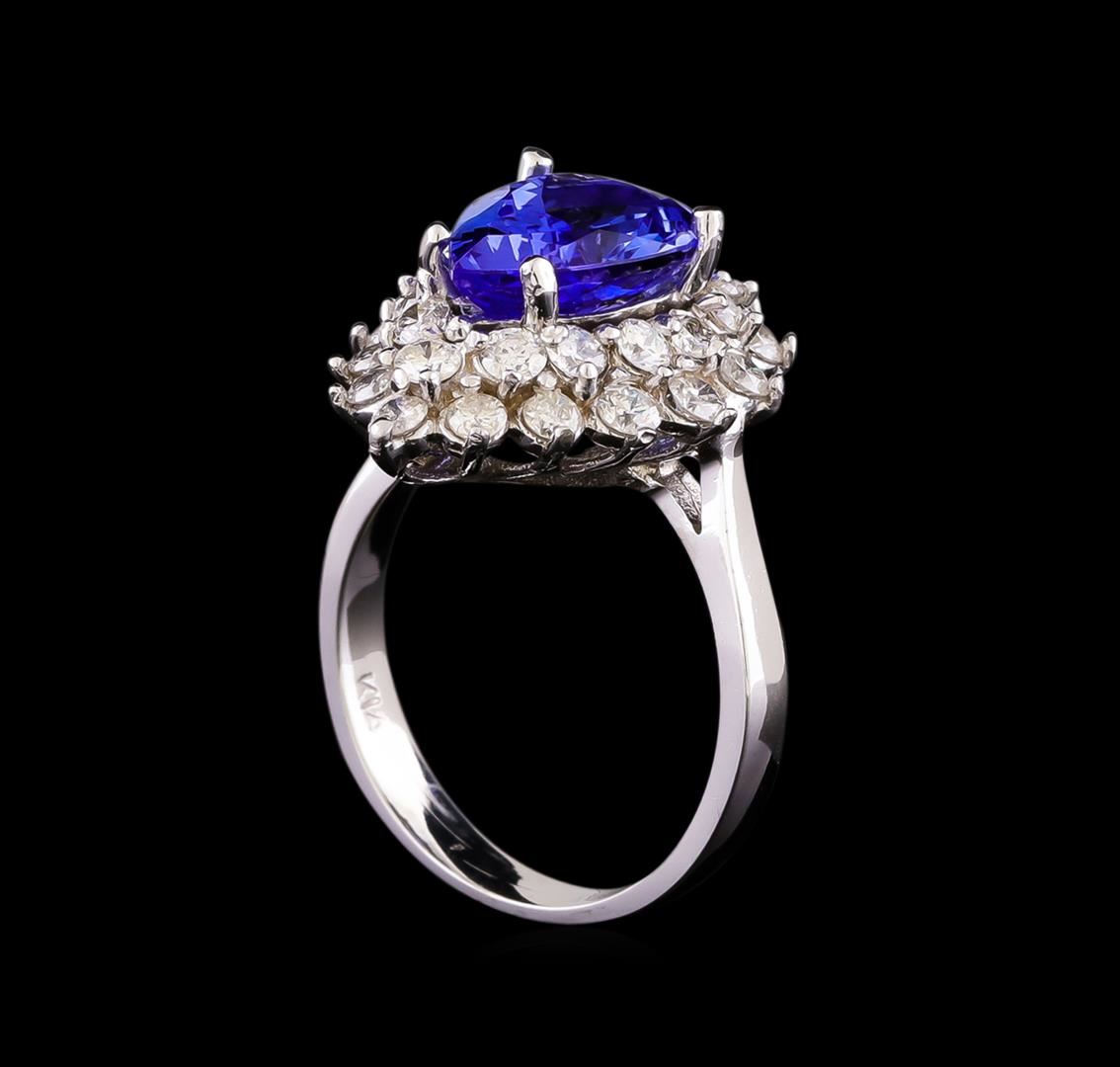 One electronically tested 14KT white gold ladies combination cast & assembled tanzanite and diamond ring with a flat shank with a bright polish finish. Identified with markings of "K14". Condition is new. Containing: One prong set pear modified brilliant cut natural tanzanite, measuring 12.00 x 8.01 x 5.66mm, approximate weight of 3.65ct., clarity is eye clean, type I, medium, very slightly grayish, violet color, (GIA V 5/3), cut is good. Twenty-Nine prong set round brilliant cut diamonds, measuring 2.50 - 2.00 x 1.35mm (depth est.) approximate total weight of 29 Stones = 1.21ct. Clarity: SI-1 to I-1. Color: J, Cut is Good. Colored gemstones are presumed to have been subjected to commonly used enhancement processes. All diamonds and colored gemstones are graded in the mounting, unless otherwise stated. Total Weight of Colored Stones 3.65ct. Total Weight of Diamonds 1.21ct. Total Weight of Ring 6.10 grams. GGL Appraised at $9,495.00.