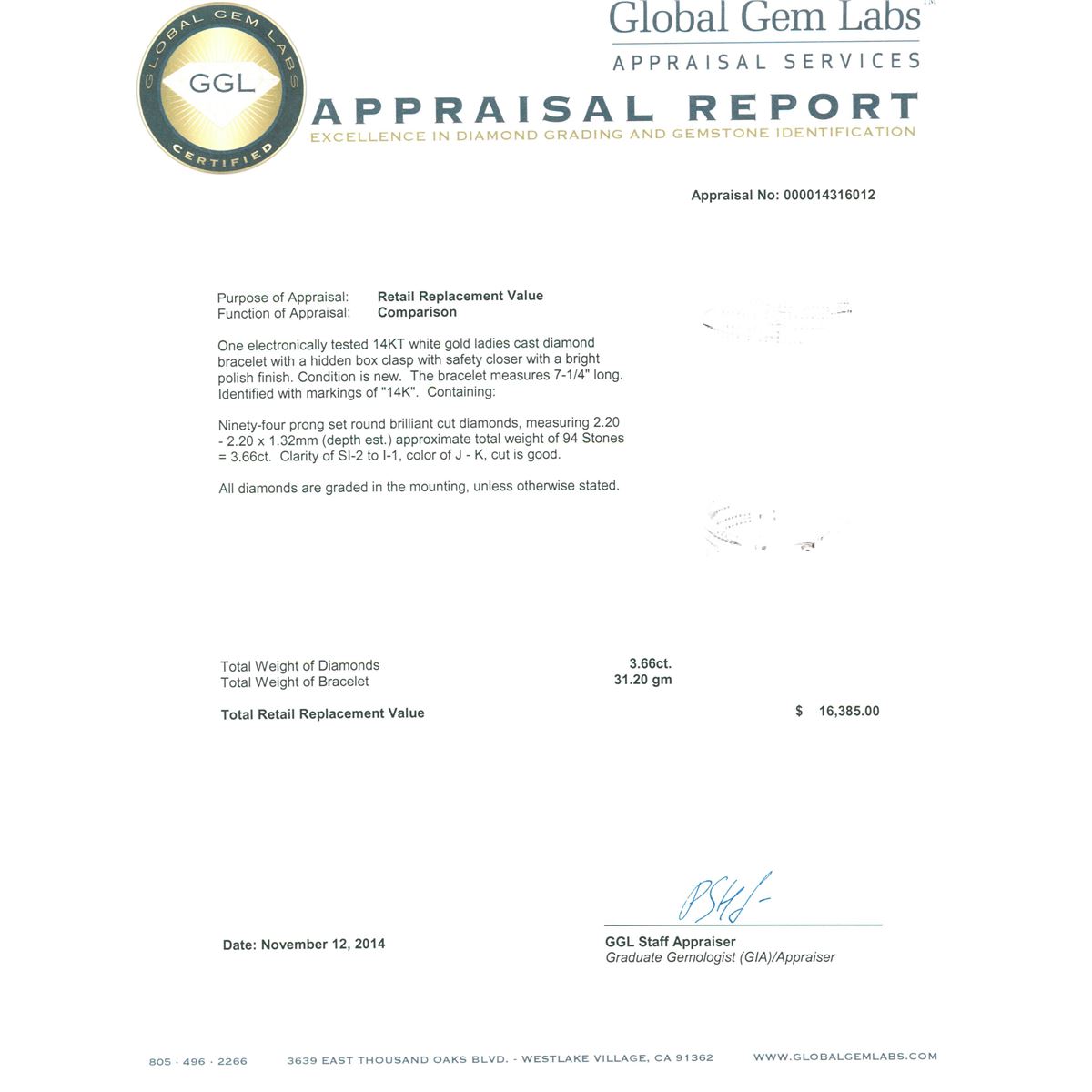 One electronically tested 14KT white gold ladies cast diamond bracelet with a hidden box clasp with safety closer with a bright polish finish. The bracelet measures 7-1/4" long. Identified with markings of "14K". Condition is new. Containing: Ninety-Four prong set round brilliant cut diamonds, measuring 2.20 - 2.20 x 1.32mm (depth est.) approximate total weight of 94 Stones = 3.66ct. Clarity: SI-2 to I-1. Color: J - K, Cut is Good. All diamonds are graded in the mounting, unless otherwise stated. Total Weight of Diamonds 3.66ct. Total Weight of Bracelet 31.20 grams. GGL Appraised at $16,385.00.