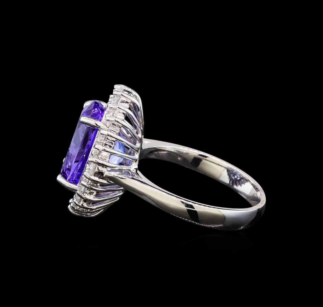 One electronically tested 14KT white gold ladies cast tanzanite and diamond ring with a bright polish finish. Identified with markings of "14K". Condition is new. Containing: One prong set oval modified brilliant cut natural tanzanite, measuring 10.49 x 9.81 x 5.07mm, approximate weight of 3.67ct., clarity is eye clean, type I, medium, very slightly grayish, violet color, (GIA V 5/3), cut is good. Four prong set round brilliant cut diamonds, measuring 2.90 - 2.90 x 1.74mm (depth est.) approximate total weight of 4 Stones = 0.36ct. Clarity: SI-1 to SI-2. Color: I - J, Cut is Good. Sixteen prong set round brilliant cut diamonds, measuring 1.70 - 1.70 x 1.02mm (depth est.) approximate total weight of 16 Stones = 0.29ct. Clarity: SI-1 to SI-2. Color: I - J, Cut is Good. Colored gemstones are presumed to have been subjected to commonly used enhancement processes. All diamonds and colored gemstones are graded in the mounting, unless otherwise stated. Total Weight of Colored Stones 3.67ct. Total Weight of Diamonds 0.64ct. Total Weight of Ring 6.50 grams. GGL Appraised at $5,615.00.