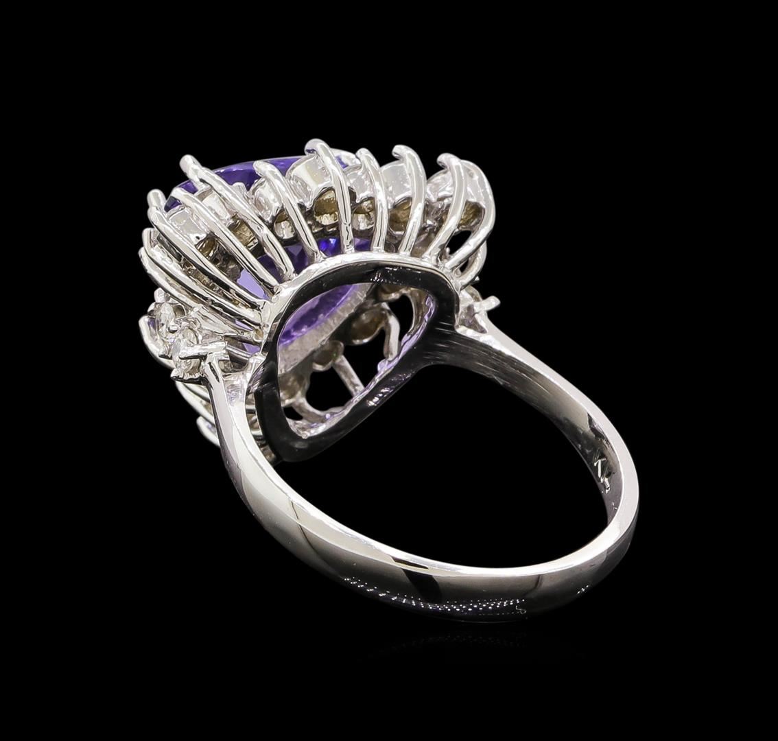 One electronically tested 14KT white gold ladies combination cast & assembled tanzanite and diamond ring with a bright polish finish. Identified with markings of "14K". Condition is new. Containing: One prong set triangle modified brilliant cut natural tanzanite, measuring 10.00 x 10.00 x 6.09mm, approximate weight of 3.67ct., clarity is eye clean, type I, medium light, very slightly grayish, bluish violet color, (GIA bV 4/3), cut is good. Twenty-Two prong set round brilliant cut diamonds, measuring 2.50 - 1.80 x 1.29mm (depth est.) approximate total weight of 22 Stones = 0.80ct. Clarity: SI-1 to SI-2. Color: I - J, Cut is Good. Colored gemstones are presumed to have been subjected to commonly used enhancement processes. All diamonds and colored gemstones are graded in the mounting, unless otherwise stated. Total Weight of Colored Stones 3.67ct. Total Weight of Diamonds 0.80ct. Total Weight of Ring 5.90 grams. GGL Appraised at $5,390.00.