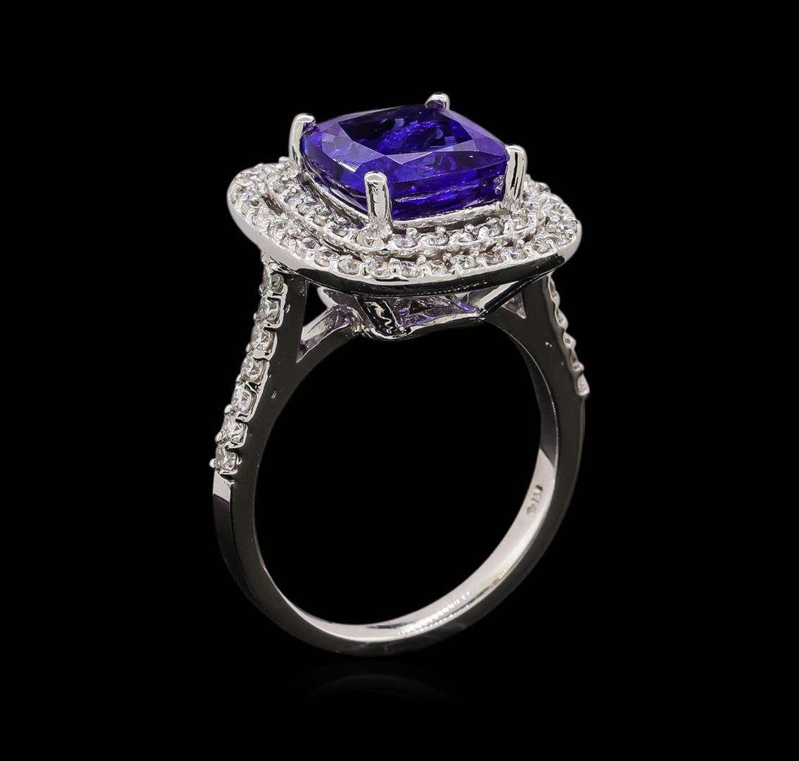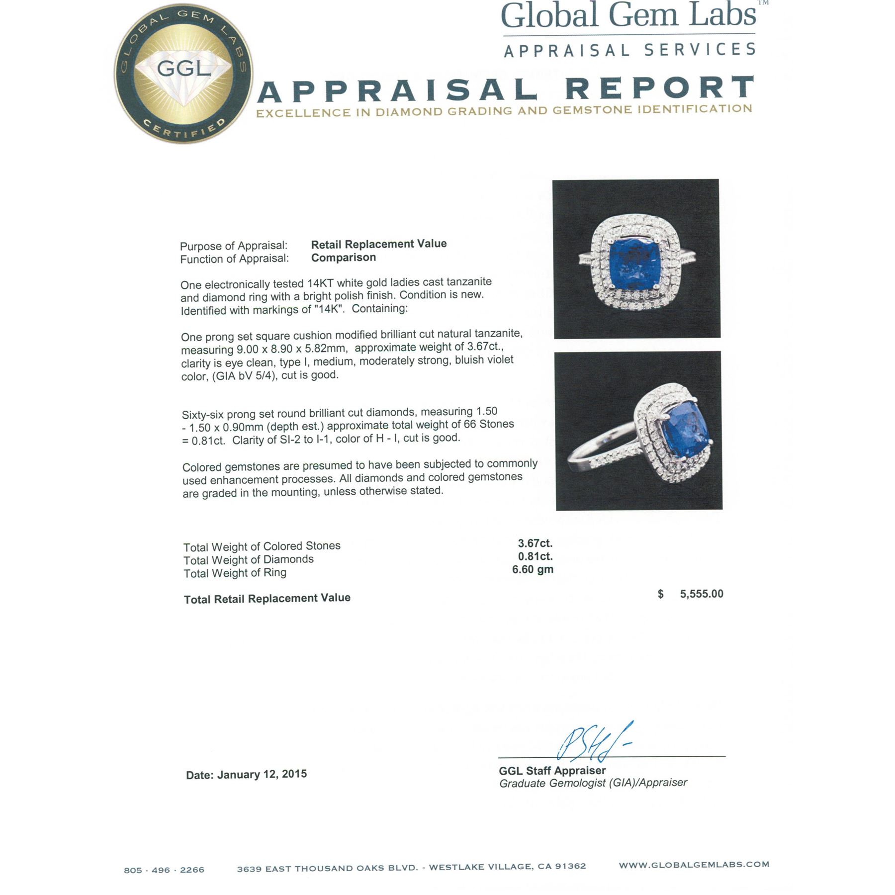 One electronically tested 14KT white gold ladies cast tanzanite and diamond ring with a bright polish finish. Identified with markings of "14K". Condition is new. Containing: One prong set square cushion modified brilliant cut natural tanzanite, measuring 9.00 x 8.90 x 5.82mm, approximate weight of 3.67ct., clarity is eye clean, type I, medium, moderately strong, bluish violet color, (GIA bV 5/4), cut is good. Sixty-Six prong set round brilliant cut diamonds, measuring 1.50 - 1.50 x 0.90mm (depth est.) approximate total weight of 66 Stones = 0.81ct. Clarity: SI-2 to I-1. Color: H - I, Cut is Good. Colored gemstones are presumed to have been subjected to commonly used enhancement processes. All diamonds and colored gemstones are graded in the mounting, unless otherwise stated. Total Weight of Colored Stones 3.67ct. Total Weight of Diamonds 0.81ct. Total Weight of Ring 6.60 grams. GGL Appraised at $5,555.00.