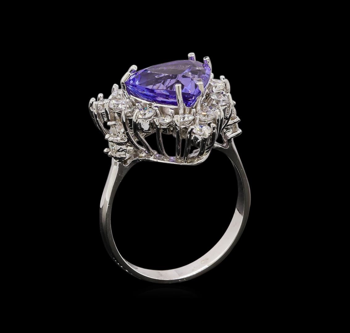 One electronically tested 14KT white gold ladies combination cast & assembled tanzanite and diamond ring with a bright polish finish. Identified with markings of "14K". Condition is new. Containing: One prong set triangle modified brilliant cut natural tanzanite, measuring 10.00 x 10.00 x 6.09mm, approximate weight of 3.67ct., clarity is eye clean, type I, medium light, very slightly grayish, bluish violet color, (GIA bV 4/3), cut is good. Twenty-Two prong set round brilliant cut diamonds, measuring 2.50 - 1.80 x 1.29mm (depth est.) approximate total weight of 22 Stones = 0.80 ct. Clarity: SI-1 to SI-2. Color: I - J, Cut is Good. Colored gemstones are presumed to have been subjected to commonly used enhancement processes. All diamonds and colored gemstones are graded in the mounting, unless otherwise stated. Total Weight of Colored Stones 3.67ct. Total Weight of Diamonds 0.80 ct. Total Weight of Ring 5.90 grams. GGL Appraised.