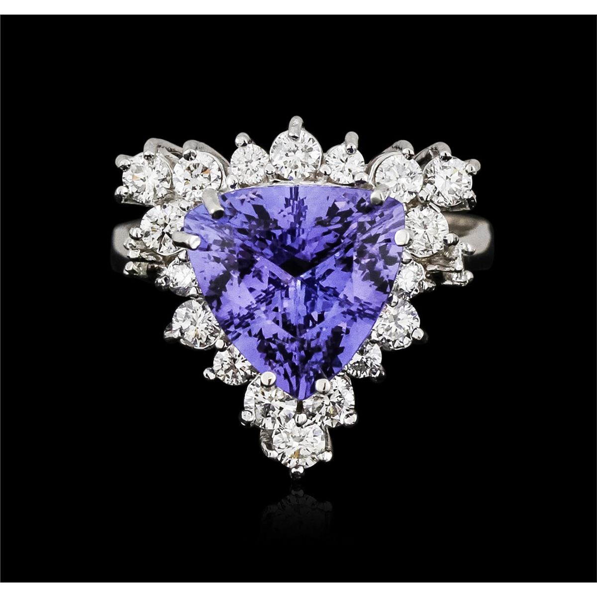 One electronically tested 14KT white gold ladies combination cast & assembled tanzanite and diamond ring with a bright polish finish. Identified with markings of "14K". Condition is new. Containing: One prong set triangle modified brilliant cut natural tanzanite, measuring 10.00 x 10.00 x 6.09mm, approximate weight of 3.67ct., clarity is eye clean, type I, medium light, very slightly grayish, bluish violet color, (GIA bV 4/3), cut is good. Twenty-Two prong set round brilliant cut diamonds, measuring 2.50 - 1.80 x 1.29mm (depth est.) approximate total weight of 22 Stones = 0.80ct. Clarity: SI-1 to SI-2. Color: I - J, Cut is Good. Colored gemstones are presumed to have been subjected to commonly used enhancement processes. All diamonds and colored gemstones are graded in the mounting, unless otherwise stated. Total Weight of Colored Stones 3.67ct. Total Weight of Diamonds 0.80ct. Total Weight of Ring 5.90 grams. GGL Appraised at $5,390.00.