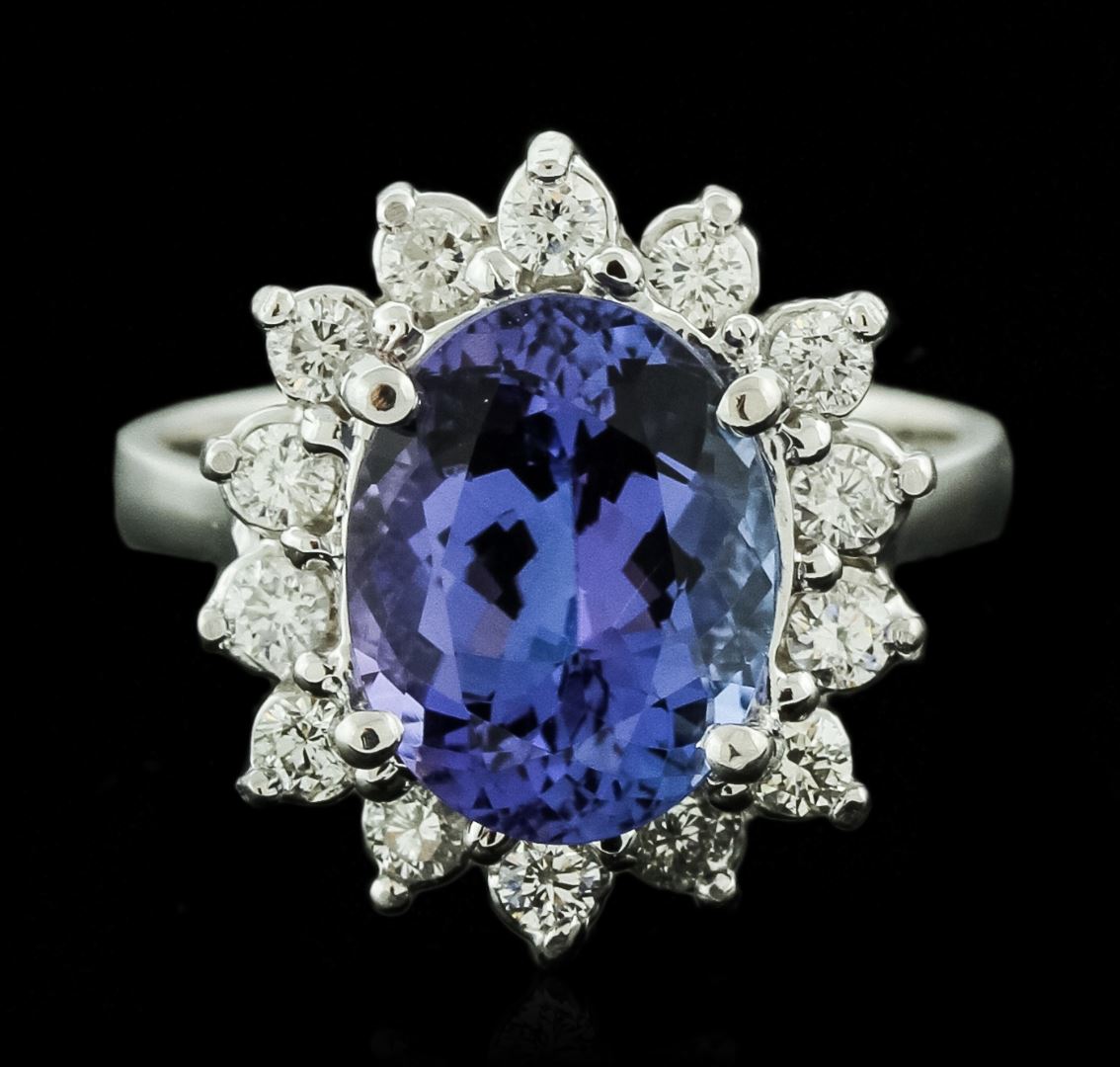 One electronically tested 14KT white gold ladies cast tanzanite and diamond ring with a bright polish finish. Identified with markings of "K14". Condition is new. Containing: One prong set oval modified brilliant cut natural tanzanite, measuring 11.10 x 8.50 x 5.53mm, approximate weight of 3.67ct., clarity is eye clean, type I, medium, very slightly grayish, violet color, (GIA V 5/3), cut is good. Fourteen prong set round brilliant cut diamonds, measuring 2.30 - 2.30 x 1.38mm (depth est.) approximate total weight of 14 Stones = 0.62ct. Clarity: SI-1. Color: H - I, Cut is Good. Colored gemstones are presumed to have been subjected to commonly used enhancement processes. All diamonds and colored gemstones are graded in the mounting, unless otherwise stated. Total Weight of Colored Stones 3.67ct. Total Weight of Diamonds 0.62ct. Total Weight of Ring 5.90 grams. GGL Appraised at $4,670.00.