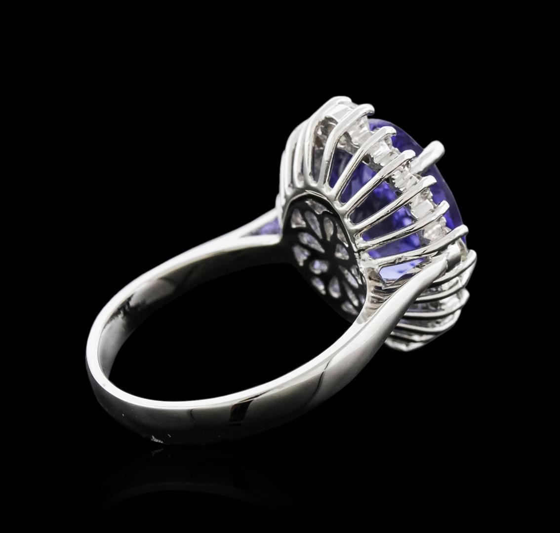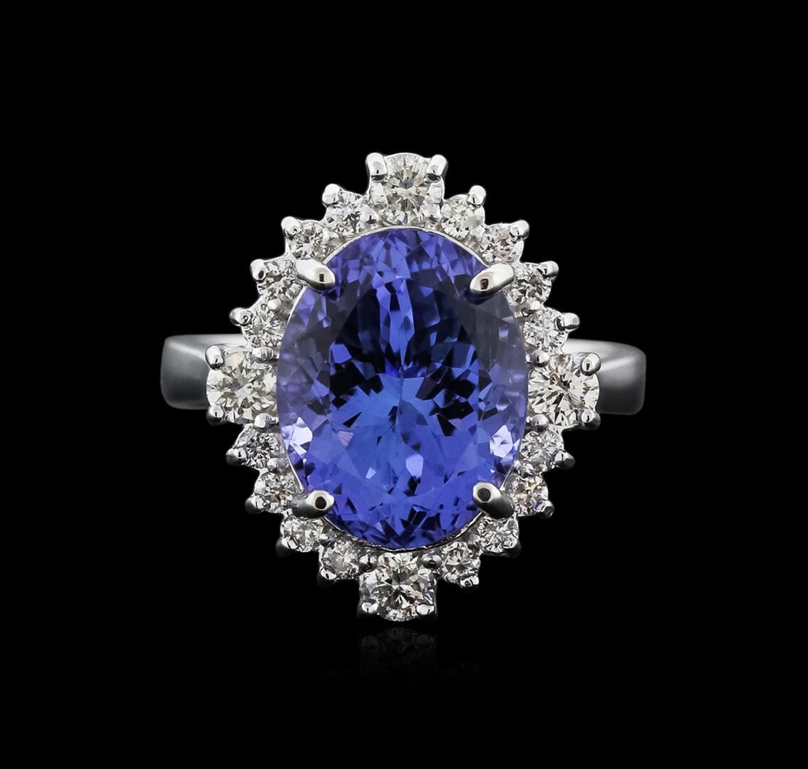 One electronically tested 14KT white gold ladies cast tanzanite and diamond ring with a bright polish finish. Identified with markings of "14K". Condition is new. Containing: One prong set oval modified brilliant cut natural tanzanite, measuring 10.49 x 9.81 x 5.07mm, approximate weight of 3.67ct., clarity is eye clean, type I, medium, very slightly grayish, violet color, (GIA V 5/3), cut is good. Four prong set round brilliant cut diamonds, measuring 2.90 - 2.90 x 1.74mm (depth est.) approximate total weight of 4 Stones = 0.36ct. Clarity: SI-1 to SI-2. Color: I - J, Cut is Good. Sixteen prong set round brilliant cut diamonds, measuring 1.70 - 1.70 x 1.02mm (depth est.) approximate total weight of 16 Stones = 0.29ct. Clarity: SI-1 to SI-2. Color: I - J, Cut is Good. Colored gemstones are presumed to have been subjected to commonly used enhancement processes. All diamonds and colored gemstones are graded in the mounting, unless otherwise stated. Total Weight of Colored Stones 3.67ct. Total Weight of Diamonds 0.64ct. Total Weight of Ring 6.50 grams. GGL Appraised at $5,615.00.