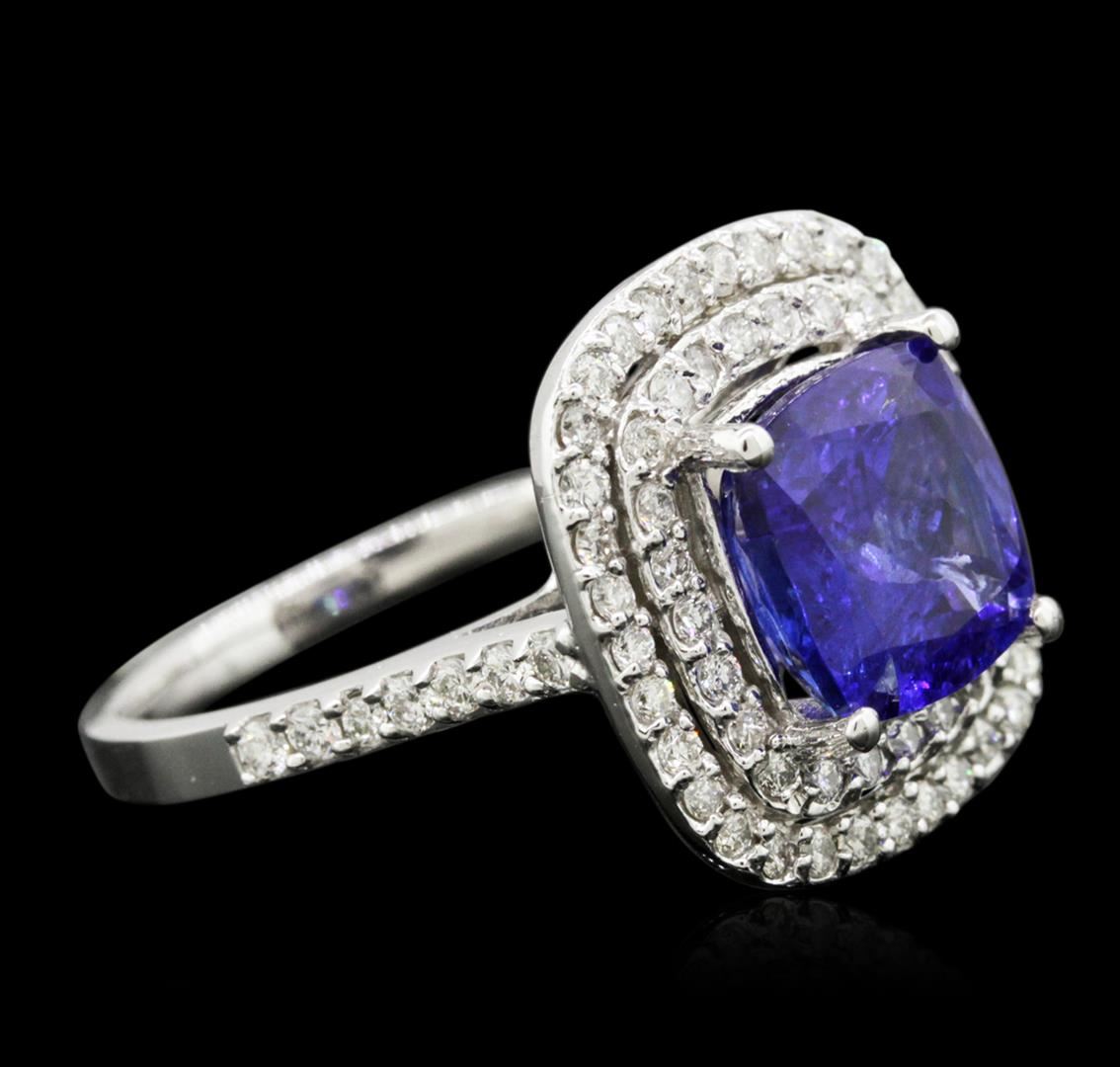 One electronically tested 14KT white gold ladies cast tanzanite and diamond ring with a bright polish finish. Identified with markings of "14K". Condition is new. Containing: One prong set square cushion modified brilliant cut natural tanzanite, measuring 9.00 x 8.90 x 5.82mm, approximate weight of 3.67ct., clarity is eye clean, type I, medium, moderately strong, bluish violet color, (GIA bV 5/4), cut is good. Sixty-Six prong set round brilliant cut diamonds, measuring 1.50 - 1.50 x 0.90mm (depth est.) approximate total weight of 66 Stones = 0.81ct. Clarity: SI-2 to I-1. Color: H - I, Cut is Good. Colored gemstones are presumed to have been subjected to commonly used enhancement processes. All diamonds and colored gemstones are graded in the mounting, unless otherwise stated. Total Weight of Colored Stones 3.67ct. Total Weight of Diamonds 0.81ct. Total Weight of Ring 6.60 grams. GGL Appraised at $5,555.00.