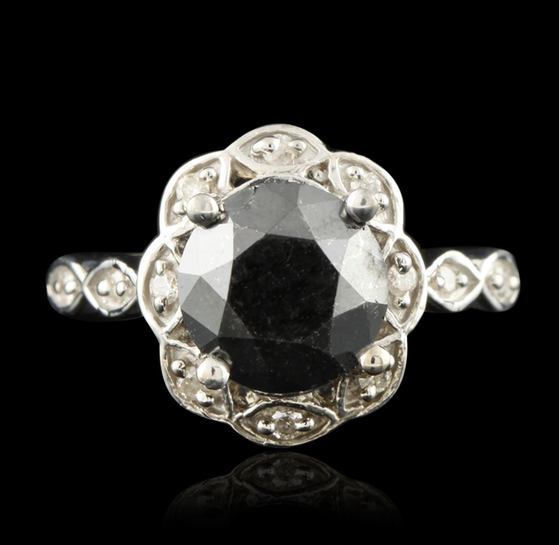 One electronically tested 14KT white gold ladies cast black and white diamond ring with a bright polish finish. Condition is good. The featured black diamond is set within a white diamond bezel, supported by diamond set shoulders and completed by a two millimeter wide band. Identified with markings of "14K". Containing: One prong set round brilliant cut diamond, measuring 9.05 – 9.05 x 5.43mm (depth est.), 8.00% GTCF approximate weight of 3.68ct. Indications of Multiple laboratory enhancements. Graded in the setting. Clarity Déclassé. Color Fancy Black; Irradiated. Depth 60.0%. Table 55.3%. Twelve prong set round brilliant cut diamonds, measuring 1.60 – 1.50 x 0.93mm (depth est.) approximate total weight of 12 Stones = 0.26ct. Faint brown secondary color throughout. Graded in the setting. Clarity I-1 to I-2. Color I – K. Total Weight of Diamonds 3.94ct. Total Weight of Ring 5.50gm. AIG Appraised at $4,505.00.