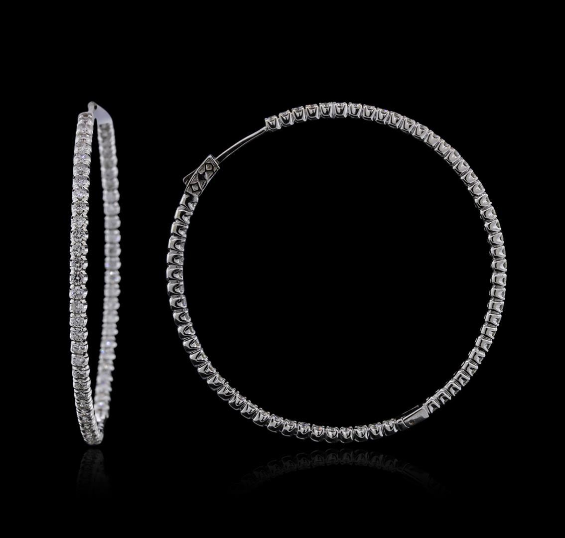 One pair electronically tested 14KT white gold ladies cast diamond hoop earrings with hinged clip backs with a bright polish finish. Condition is new. Containing: One Hundred Twenty-Six prong set round brilliant cut diamonds, measuring 2.00 - 2.00 x 1.20mm (depth est.) approximate total weight of 126 Stones = 3.68ct. Clarity: SI-1 to SI-2. Color: I - J, Cut is Good. All diamonds are graded in the mounting, unless otherwise stated. Total Weight of Diamonds 3.68ct. Total Weight of Hoop Earrings 16.20 grams. GGL Appraised at $8,025.00.