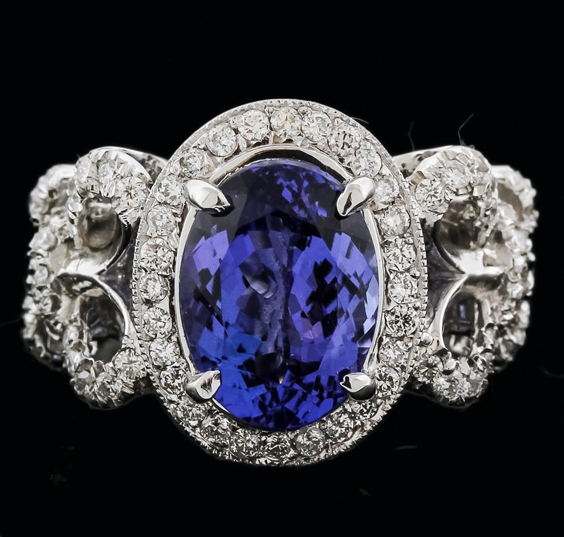 One electronically tested 14KT white gold ladies cast tanzanite and diamond ring with a bright polish finish. Identified with markings of "K14". Condition is new. Containing: One prong set oval modified brilliant cut natural tanzanite, measuring 12.00 x 8.20 x 5.33mm, approximate weight of 3.69ct., clarity is eye clean, type I, medium light, very slightly grayish, violet color, (GIA V 4/3), cut is good. Seventy-Six prong set round brilliant cut diamonds, measuring 1.30 - 1.30 x 0.78mm (depth est.) approximate. Total Weight of 76 Stones = 0.61ct. Clarity: I-1 to I-2. Color: I - J, Cut is Good. Colored gemstones are presumed to have been subjected to commonly used enhancement processes. All diamonds and colored gemstones are graded in the mounting, unless otherwise stated. Total Weight of Colored Stones 3.69ct. Total Weight of Diamonds 0.61ct. Total Weight of Ring 7.70 grams. GGL Appraised at $4,695.00.