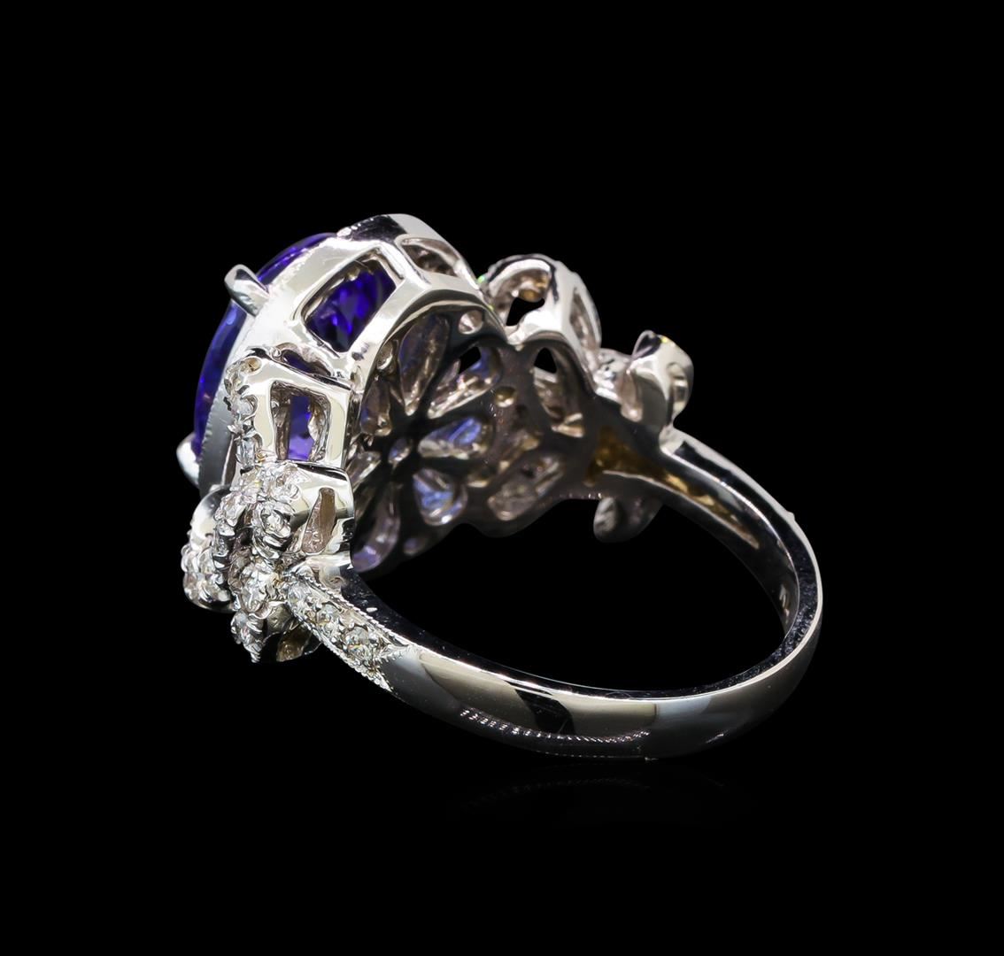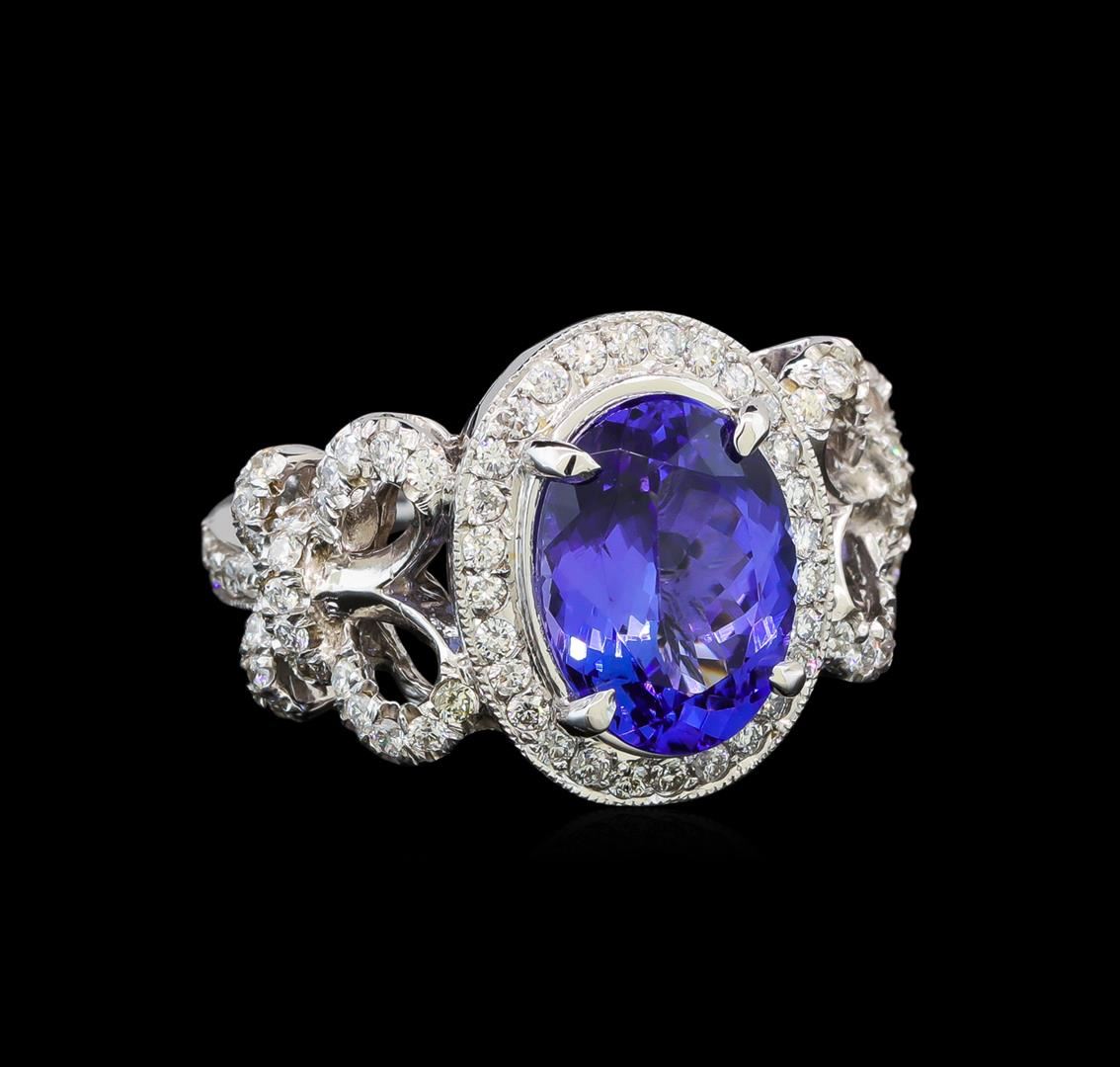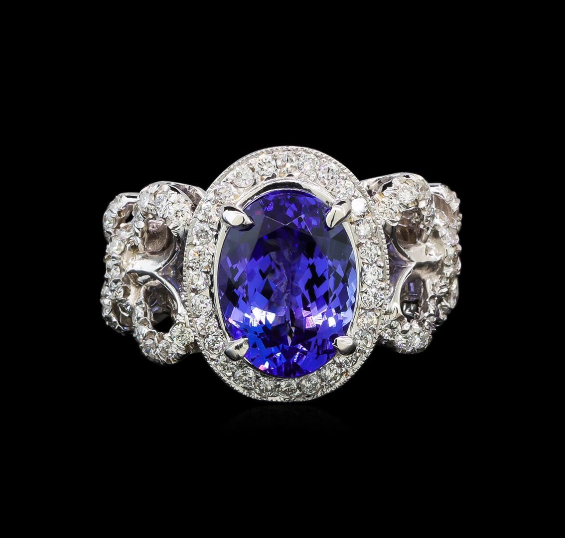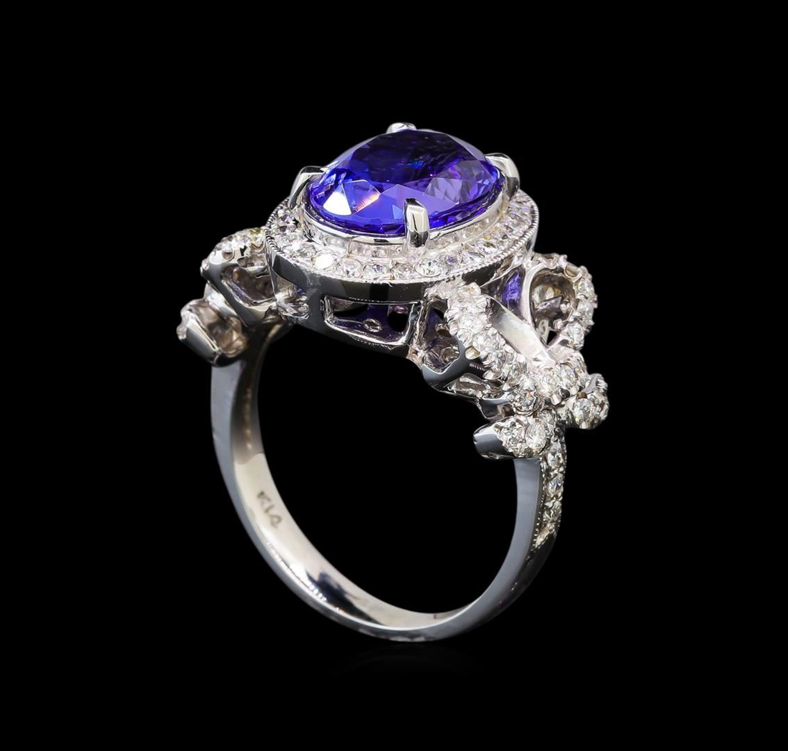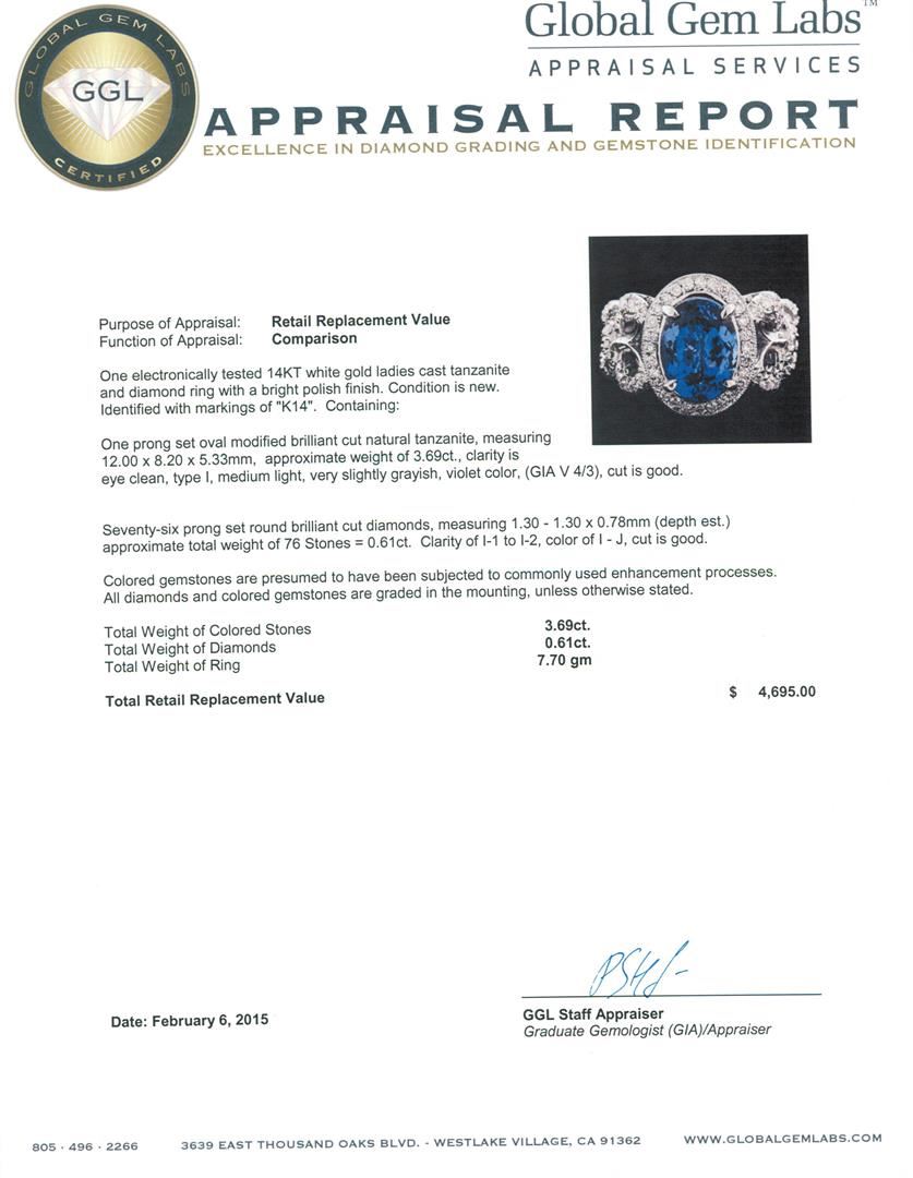 One electronically tested 14KT white gold ladies cast tanzanite and diamond ring with a bright polish finish. Identified with markings of "K14". Condition is new. Containing: One prong set oval modified brilliant cut natural tanzanite, measuring 12.00 x 8.20 x 5.33mm, approximate weight of 3.69ct., clarity is eye clean, type I, medium light, very slightly grayish, violet color, (GIA V 4/3), cut is good. Seventy-Six prong set round brilliant cut diamonds, measuring 1.30 - 1.30 x 0.78mm (depth est.) approximate. Total Weight of 76 Stones = 0.61ct. Clarity: I-1 to I-2. Color: I - J, Cut is Good. Colored gemstones are presumed to have been subjected to commonly used enhancement processes. All diamonds and colored gemstones are graded in the mounting, unless otherwise stated. Total Weight of Colored Stones 3.69ct. Total Weight of Diamonds 0.61ct. Total Weight of Ring 7.70 grams. GGL Appraised at $4,695.00.