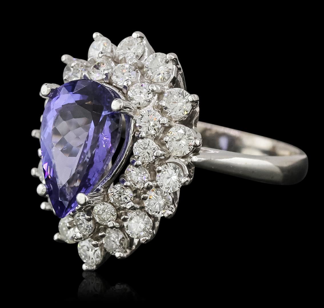 One electronically tested 14KT white gold ladies combination cast & assembled tanzanite and diamond ring with a flat shank with a bright polish finish. Identified with markings of "K14". Condition is new. Containing: One prong set pear modified brilliant cut natural tanzanite, measuring 12.30 x 8.11 x 5.52mm, approximate weight of 3.69ct., clarity is eye clean, type I, medium, moderately strong, violet color, (GIA V 5/4), cut is good. Thirty-One prong set round brilliant cut diamonds, measuring 2.50 - 2.00 x 1.35mm (depth est.) approximate total weight of 31 Stones = 1.29ct. Clarity: I-1. Color: I - J, Cut is Good. Colored gemstones are presumed to have been subjected to commonly used enhancement processes. All diamonds and colored gemstones are graded in the mounting, unless otherwise stated. Total Weight of Colored Stones 3.69ct. Total Weight of Diamonds 1.29ct. Total Weight of Ring 7.40 grams. GGL Appraised.