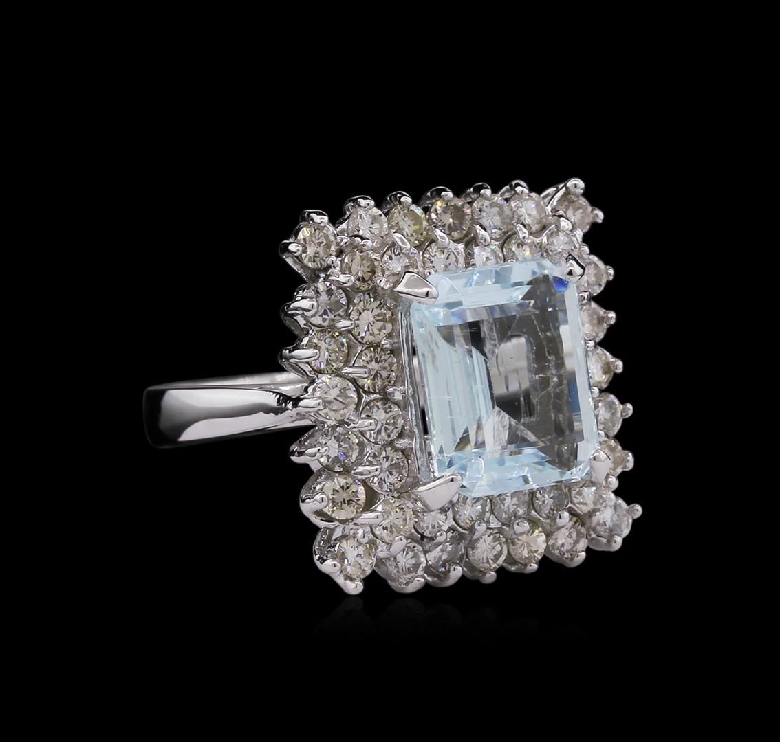One electronically tested 14KT white gold ladies cast aquamarine and diamond ring with a bright polish finish. Condition is new, good workmanship. The featured aquamarine is set within two tiered diamond bezels supported by split shoulders, completed by a three and one-half millimeter wide band. Identified with markings of "K14". Containing: One prong set rectangular step cut natural aquamarine, measuring 10.40 x 8.15 x 4.85mm, 10%. bulge factor, approximate weight of 3.69ct., clarity is slightly included, type I, medium, very slightly grayish, very strongly greenish blue color, (GIA vstgB 5/3), cut is good. Transmitting light with a minimum of distortion, transparent. Naturally occurring internal & external characteristics are present. Refractive index testing results of 1.57 to 1.58. This is a conclusive result for beryl (aquamarine). Graded in the setting. Forty-Four prong set round brilliant cut diamonds, measuring 2.20 - 2.00 x 1.26mm (depth est.) approximate. Total Weight of 44 Stones = 1.59ct. Graded in the setting. Clarity: VS-2 to SI-2. Color: H - J. Total Weight of Colored Stones 3.69ct. Total Weight of Diamonds 1.59ct. Total Weight of Ring 7.86 grams. AIG Appraised at $8,085.00.