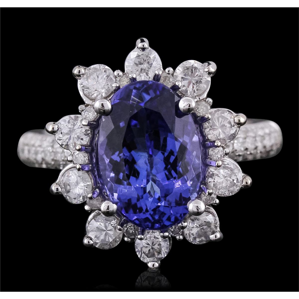 One electronically tested 14KT white gold ladies combination cast & assembled ring with a bright polish finish. Condition is new. Identified with markings of "14K". Containing: One prong set oval modified brilliant cut natural tanzanite, measuring 11.20 x 9.20 x 5.30mm, approximate weight of 3.69ct., clarity is eye clean, type I, medium, moderately strong, bluish violet color, (GIA bV 5/4), cut is good. Forty-Four prong set round brilliant cut diamonds, measuring 1.00 - 1.00 x 0.60mm (depth est.) approximate total weight of 44 Stones = 0.16ct. Clarity: I-1 to I-2. Color: H - I, Cut is Good. Ten prong set round brilliant cut diamonds, measuring 2.70 - 2.70 x 1.62mm (depth est.) approximate total weight of 10 Stones = 0.72ct. Clarity: SI-2 to I-1. Color: I - J, Cut is Good. Colored gemstones are presumed to have been subjected to commonly used enhancement processes. All diamonds and colored gemstones are graded in the mounting, unless otherwise stated. Total Weight of Colored Stones 3.69ct. Total Weight of Diamonds 0.88ct. Total Weight of Ring 5.00 grams. GGL Appraised at $9,080.00.
