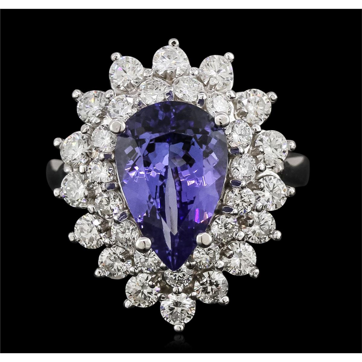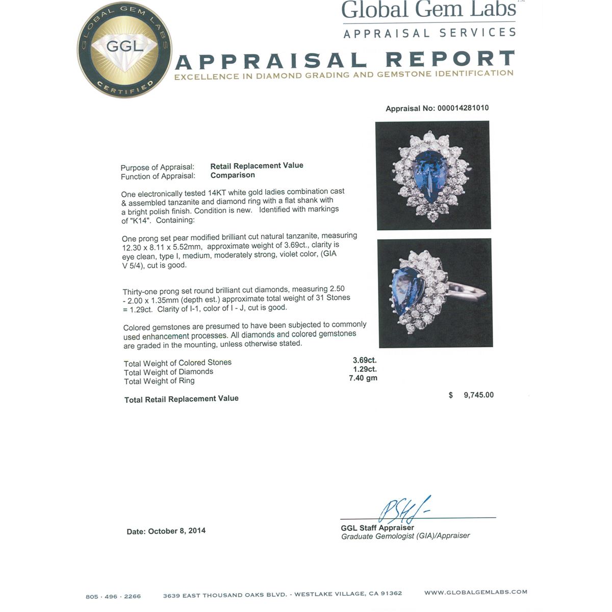 One electronically tested 14KT white gold ladies combination cast & assembled tanzanite and diamond ring with a flat shank with a bright polish finish. Identified with markings of "K14". Condition is new. Containing: One prong set pear modified brilliant cut natural tanzanite, measuring 12.30 x 8.11 x 5.52mm, approximate weight of 3.69ct., clarity is eye clean, type I, medium, moderately strong, violet color, (GIA V 5/4), cut is good. Thirty-One prong set round brilliant cut diamonds, measuring 2.50 - 2.00 x 1.35mm (depth est.) approximate total weight of 31 Stones = 1.29ct. Clarity: I-1. Color: I - J, Cut is Good. Colored gemstones are presumed to have been subjected to commonly used enhancement processes. All diamonds and colored gemstones are graded in the mounting, unless otherwise stated. Total Weight of Colored Stones 3.69ct. Total Weight of Diamonds 1.29ct. Total Weight of Ring 7.40 grams. GGL Appraised at $9,745.00.