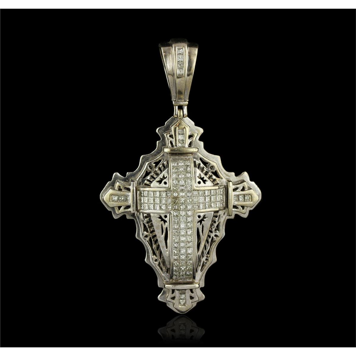 One electronically tested 14KT white gold unisex combination cast & assembled cross pendant with a bright polish finish. Condition is new. Measurements: 3.00." x 1.80". Containing: One Hundred Three invisible set princess cut diamonds, measuring 1.80 x 1.80 x 1.35mm (depth est.) approximate. Total Weight of 103 Stones = 3.69ct. Clarity: SI-2 to I-1. Color: I - J, Cut is Good. Total Weight of Diamonds 3.69ct. Total Weight of Pendant 31.50gm. GGL Appraised at $17,945.00.