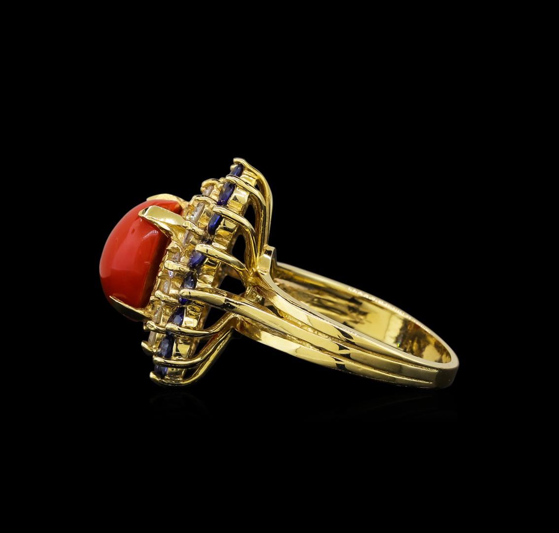 One electronically tested 14KT white gold ladies cast coral, sapphire and diamond ring with a bright polish finish. Identified with markings of "14K". Condition is new. Containing: One prong set oval cabochon cut natural red coral, measuring 11.00 x 9.00 x 5.85mm, approximate weight of 3.70ct., clarity is severely included, medium, brownish, red color, (GIA R 5/1), cut is good. Fourteen prong set round modified brilliant cut natural blue sapphires, measuring 2.50 - 2.50 x 1.63 mm, approximate total weight of 1.54ct., clarity is slightly included, type II, medium, moderately strong, blue color, (GIA B 5/4), cut is good. Fourteen prong set round brilliant cut diamonds, measuring 2.00 - 2.00 x 1.20mm (depth est.) approximate total weight of 14 Stones = 0.70ct. Clarity: SI-2 to I-1. Color: J - K, Cut is Good. Colored gemstones are presumed to have been subjected to commonly used enhancement processes. All diamonds and colored gemstones are graded in the mounting, unless otherwise stated. Total Weight of Colored Stones 5.24ct. Total Weight of Diamonds 0.70ct. Total Weight of Ring 9.20 grams. GGL Appraised at $3,475.00.