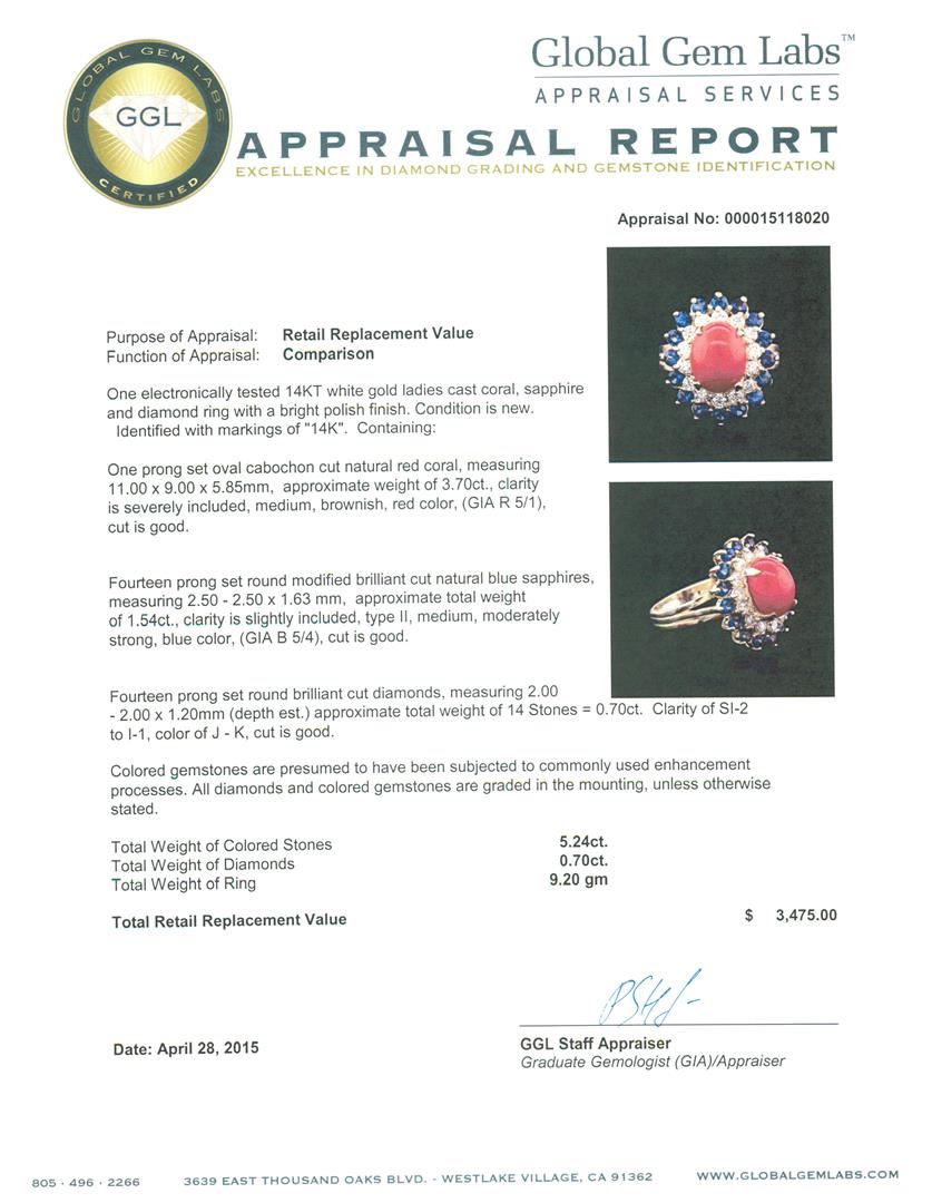 One electronically tested 14KT white gold ladies cast coral, sapphire and diamond ring with a bright polish finish. Identified with markings of "14K". Condition is new. Containing: One prong set oval cabochon cut natural red coral, measuring 11.00 x 9.00 x 5.85mm, approximate weight of 3.70ct., clarity is severely included, medium, brownish, red color, (GIA R 5/1), cut is good. Fourteen prong set round modified brilliant cut natural blue sapphires, measuring 2.50 - 2.50 x 1.63 mm, approximate total weight of 1.54ct., clarity is slightly included, type II, medium, moderately strong, blue color, (GIA B 5/4), cut is good. Fourteen prong set round brilliant cut diamonds, measuring 2.00 - 2.00 x 1.20mm (depth est.) approximate total weight of 14 Stones = 0.70ct. Clarity: SI-2 to I-1. Color: J - K, Cut is Good. Colored gemstones are presumed to have been subjected to commonly used enhancement processes. All diamonds and colored gemstones are graded in the mounting, unless otherwise stated. Total Weight of Colored Stones 5.24ct. Total Weight of Diamonds 0.70ct. Total Weight of Ring 9.20 grams. GGL Appraised at $3,475.00.