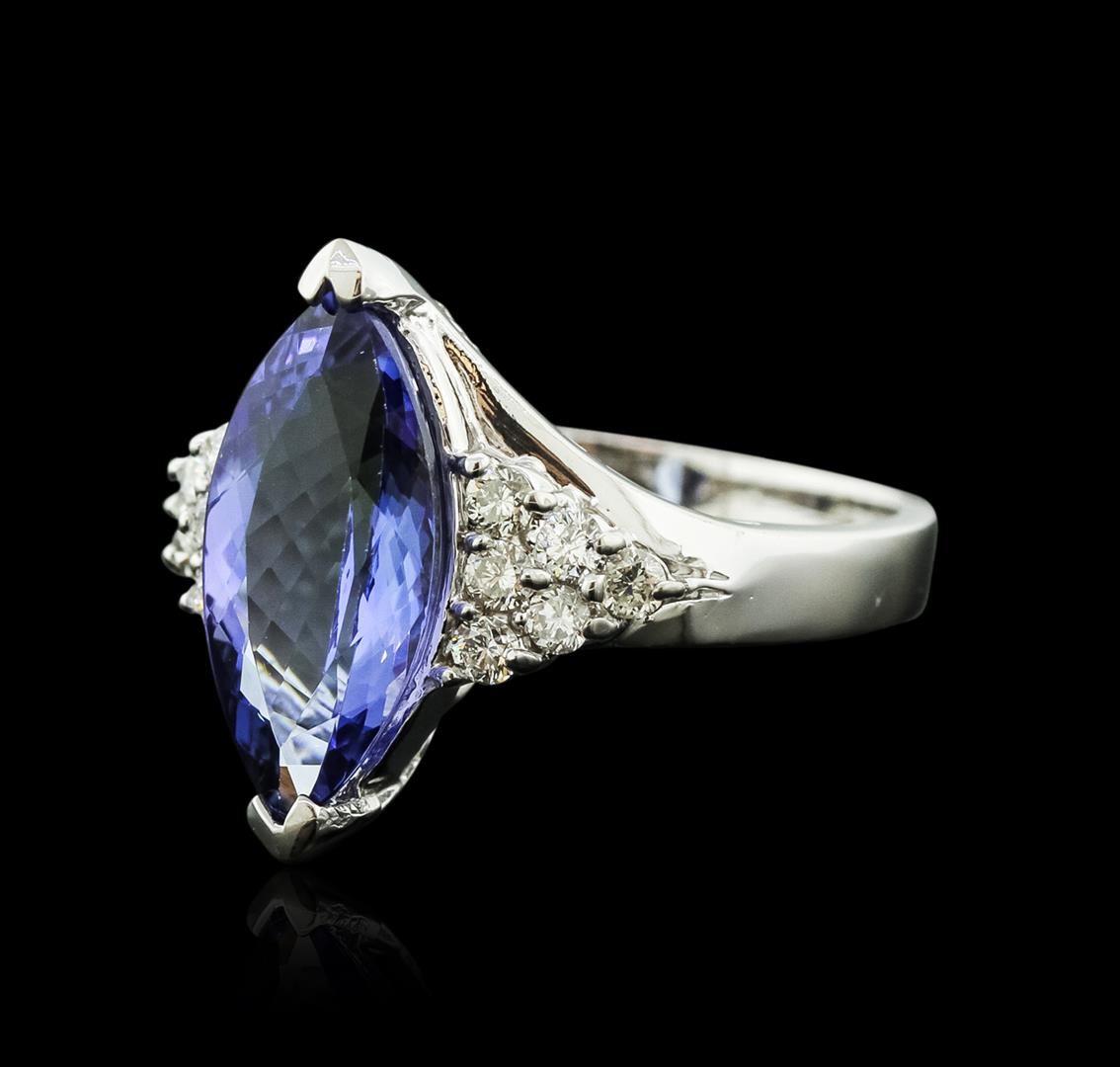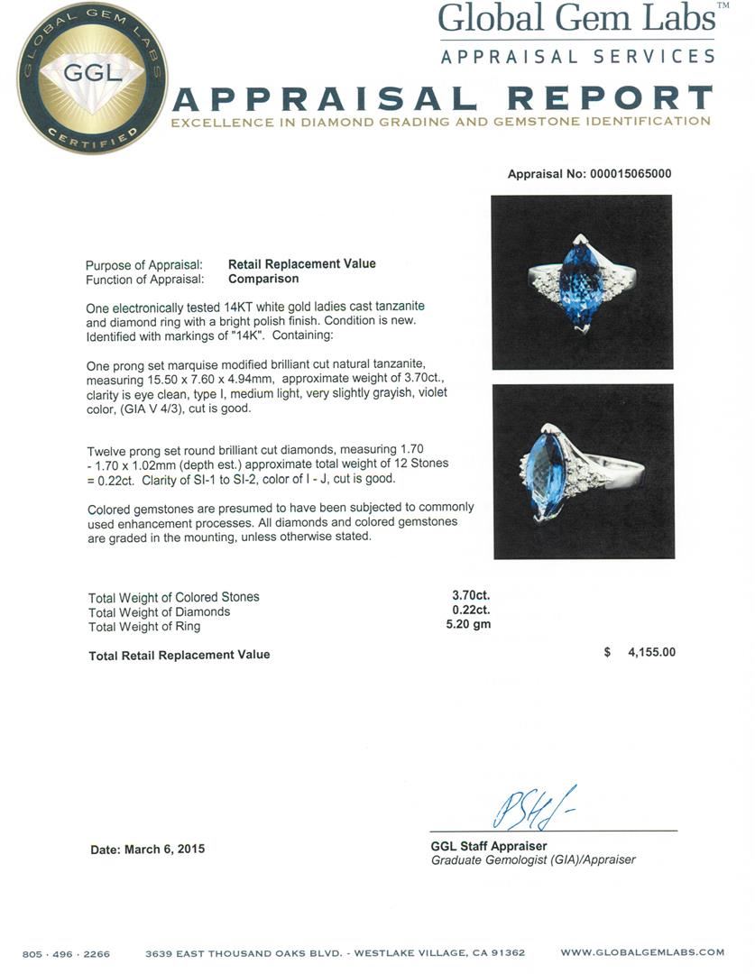 One electronically tested 14KT white gold ladies cast tanzanite and diamond ring with a bright polish finish. Identified with markings of "14K". Condition is new. Containing: One prong set marquise modified brilliant cut natural tanzanite, measuring 15.50 x 7.60 x 4.94mm, approximate weight of 3.70ct., clarity is eye clean, type I, medium light, very slightly grayish, violet color, (GIA V 4/3), cut is good. Twelve prong set round brilliant cut diamonds, measuring 1.70 - 1.70 x 1.02mm (depth est.) approximate total weight of 12 Stones = 0.22ct.. Clarity: SI-1 to SI-2. Color: I - J, Cut is Good. Colored gemstones are presumed to have been subjected to commonly used enhancement processes. All diamonds and colored gemstones are graded in the mounting, unless otherwise stated.. Total Weight of Colored Stones 3.70ct.. Total Weight of Diamonds 0.22ct.. Total Weight of Ring 5.20 grams. GGL Appraised at $4,155.00.
