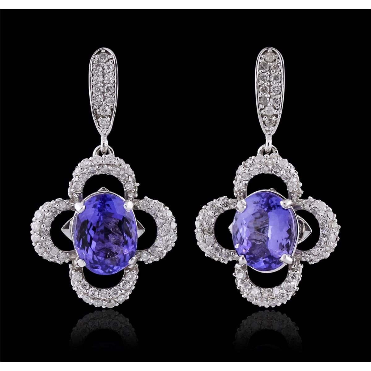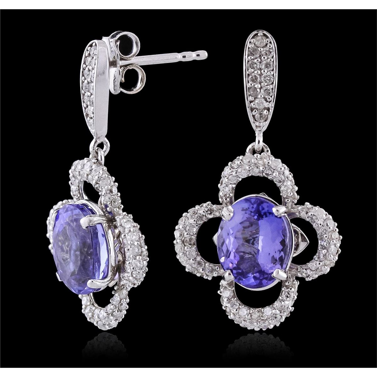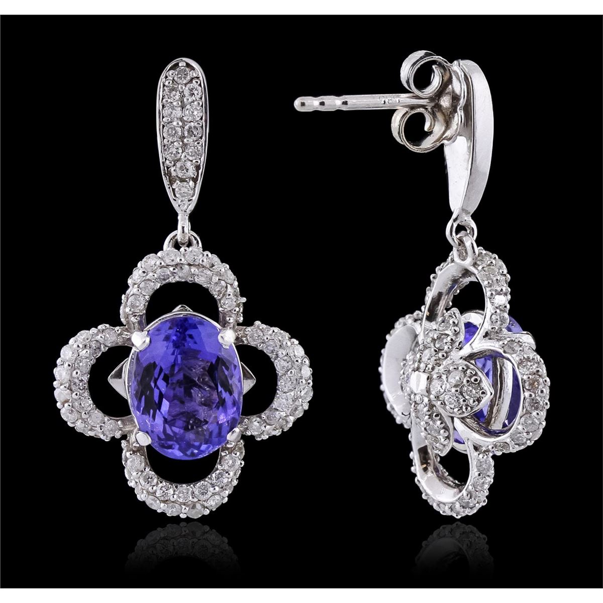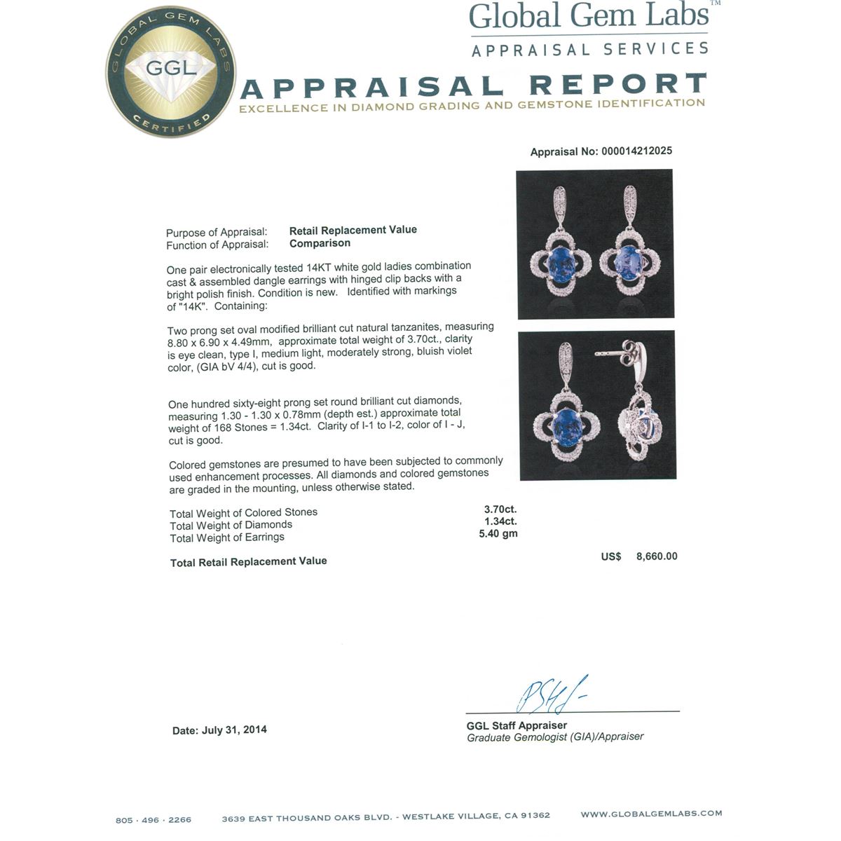 One pair electronically tested 14KT white gold ladies combination cast & assembled dangle earrings with hinged clip backs with a bright polish finish. Condition is new. Identified with markings of "14K". Containing: Two prong set oval modified brilliant cut natural tanzanites, measuring 8.80 x 6.90 x 4.49mm, approximate. Total Weight of 3.70ct., clarity is eye clean, type I, medium light, moderately strong, bluish violet color, (GIA bV 4/4), cut is good. One Hundred Sixty-Eight prong set round brilliant cut diamonds, measuring 1.30 - 1.30 x 0.78mm (depth est.) approximate. Total Weight of 168 Stones = 1.34ct. Clarity: I-1 to I-2. Color: I - J, Cut is Good. Colored gemstones are presumed to have been subjected to commonly used enhancement processes. All diamonds and colored gemstones are graded in the mounting, unless otherwise stated. Total Weight of Colored Stones 3.70ct. Total Weight of Diamonds 1.34ct. Total Weight of Earrings 5.40 grams. GGL Appraised at $8,660.00.